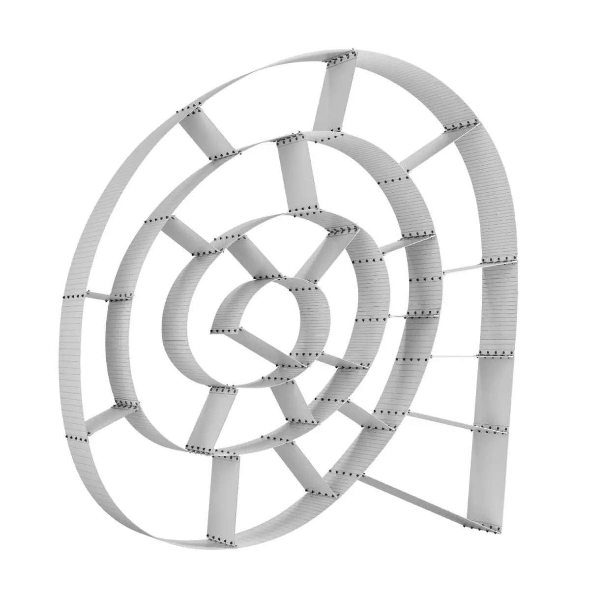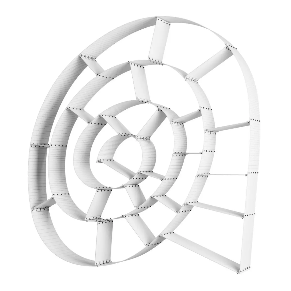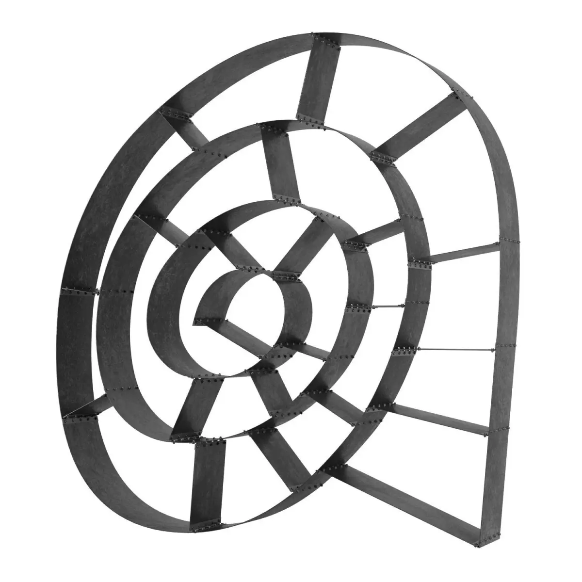 This is a sculptural product made of a metal sheet bent into an unusual shape, resembling waves or ribbons intertwined with each other. The shelf can be used to store books, magazines, decor items and other things, and can be placed on the wall or on the floor.