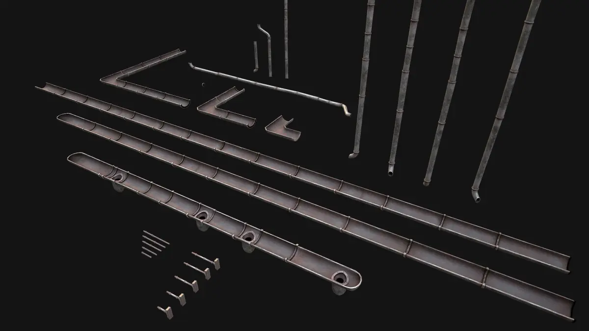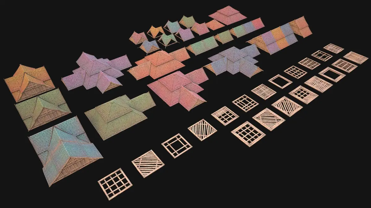Game ready Roof Set Medieval City Pack .The model contains lods, detailed information on the images.Stylized and detailed Roof Set Medieval City Pack Constructor textured, sculpted and rendered with Physical based rendering (PBR) - Shown images have been rendered in Marmoset Toolbag .The set contains 27 models of roof with tiles and 20 models of wooden ceilings as well as 1 model of ventilation,as well as a constructor for creating Gutter.