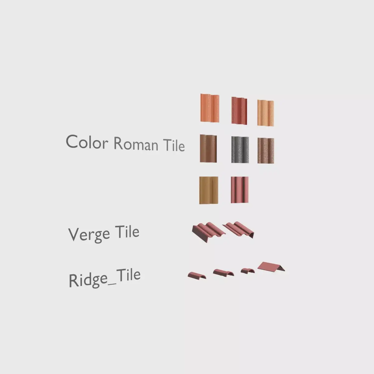 The kit allows assembling tiled roofs using modular Roman regular, ridge and verge elements.Roof sections can be built from individual tiles or quickly assembled using the included roof module.Several color variations are available for Roman tiles.Customization available upon request:• module dimension adjustments• materials and color changes• creation of roof modules for different roof typesContact via messages.Useful information:When assembling roof sections using the Array modifier, it is recommended to set the tile placement step to 0.962 along the required axis.TopologyAll components are created in real-world scale and feature clean, optimized topology suitable for architectural visualization and close-up rendering.