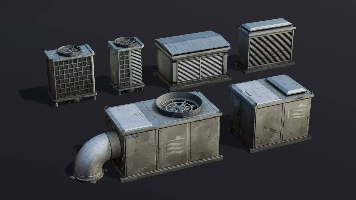 This pack includes 6 detailed 3D large roof vent models, designed in an industrial style and commonly used for mechanical ventilation on rooftops. All assets are optimized for real-time use with high-resolution baked textures and full PBR workflow, making them ideal for games, architectural visualization, and other 3D projects.