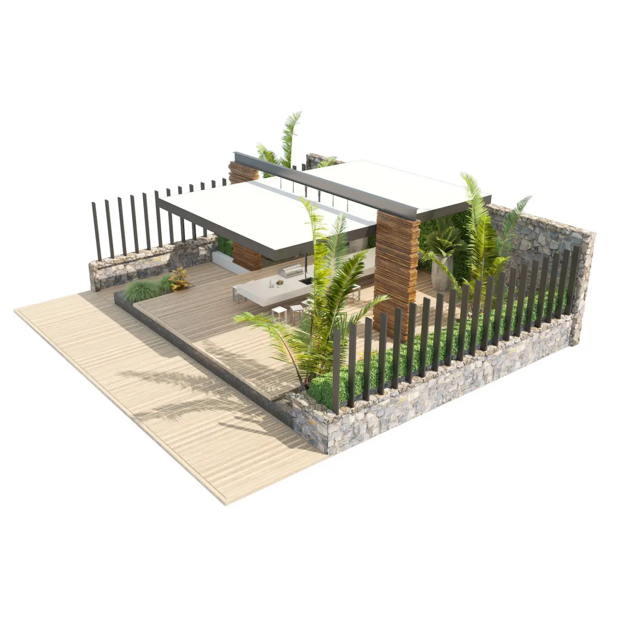 Highly detailed 3d model of modern house terrace with greenery plants, unreal animation ready, you can watch animation on: https://youtu.be/wrm4YUtqAjgperfect to use in house backyard design, spring and summer exterior, park, public and private garden with outdoor furniture, made with models created as a separate unit then assembled in garden and backyard model, which if necessary can be blocked in different garden shape or used separately.