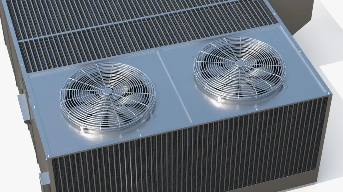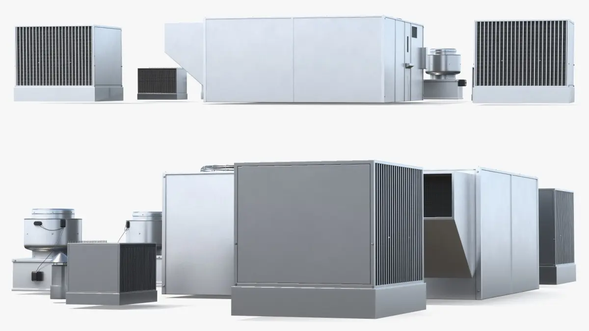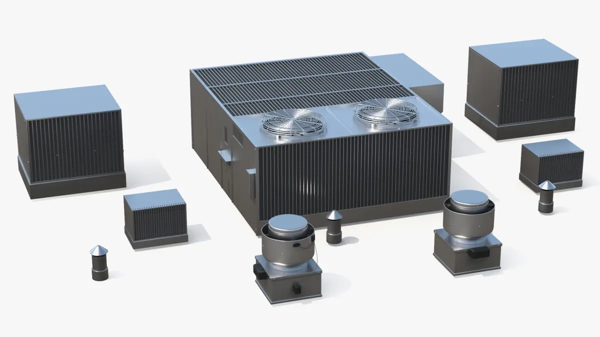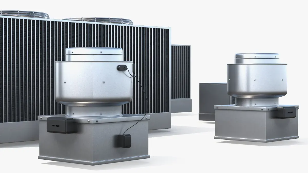 For construction planning, ventilation fan machinery, industrial outdoor units, air conditioning equipment, architectural visualization, HVAC system design, industrial engineering, mechanical engineering projects, urban building services, educational purposes in HVAC technology, technical manuals, energy-efficient building design, infrastructure development, modern industrial facility layouts, and rooftop engineering concepts.