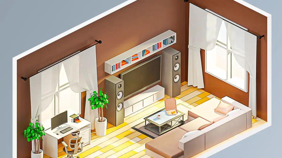 Walls, stairs, fences, sofa, chairs, bathroom assets, kitchen assets, bed, closet, clothing, table, door, props, flooring, flowers, lamp, window, pictures, etc.;