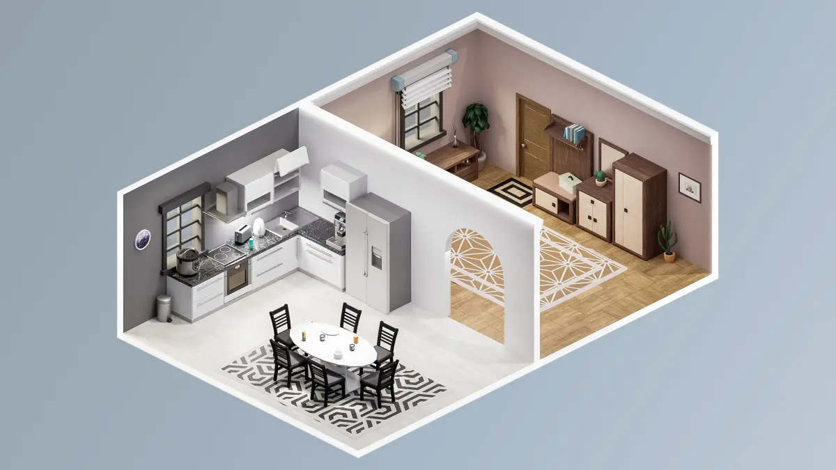 Walls, stairs, fences, sofa, chairs, bathroom assets, kitchen assets, bed, closet, clothing, table, door, props, flooring, flowers, lamp, window, pictures, etc.;