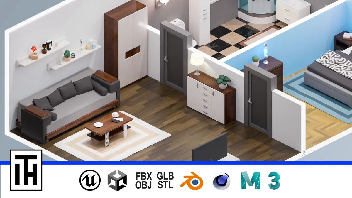 Walls, stairs, fences, sofa, chairs, bathroom assets, kitchen assets, bed, closet, clothing, table, door, props, flooring, flowers, lamp, window, pictures, etc.;