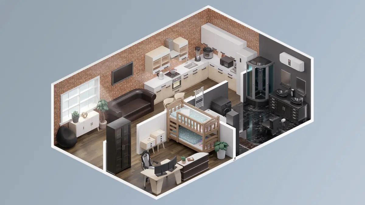 Walls, stairs, fences, sofa, chairs, bathroom assets, kitchen assets, bed, closet, clothing, table, door, props, flooring, flowers, lamp, window, pictures, etc.;