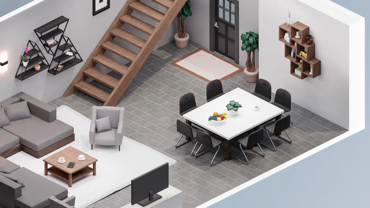 Walls, stairs, fences, sofa, chairs, bathroom assets, kitchen assets, bed, closet, clothing, table, door, props, flooring, flowers, lamp, window, pictures, etc.;