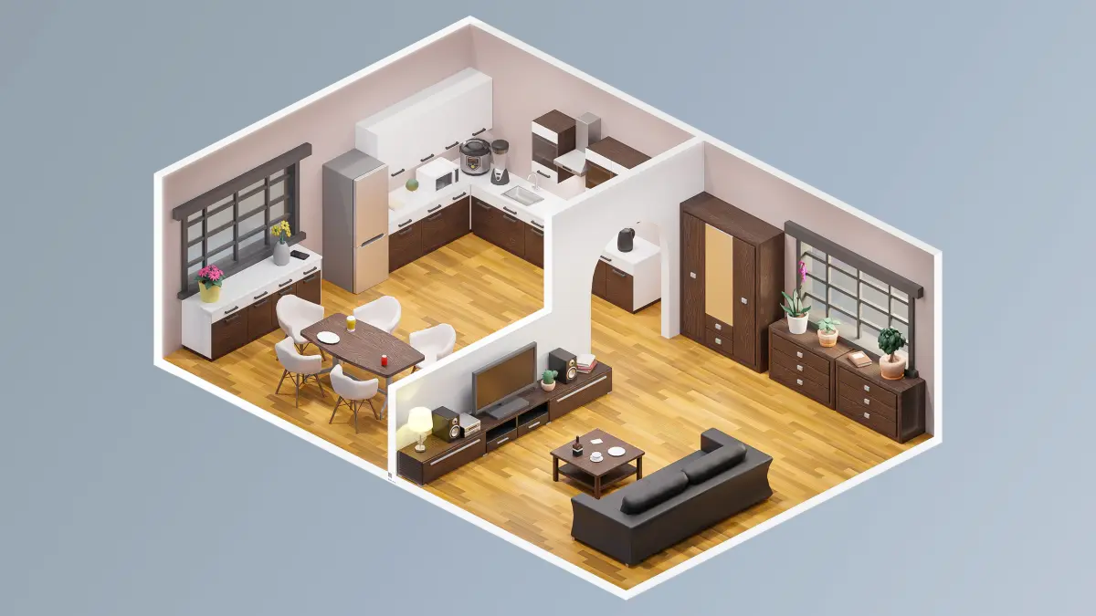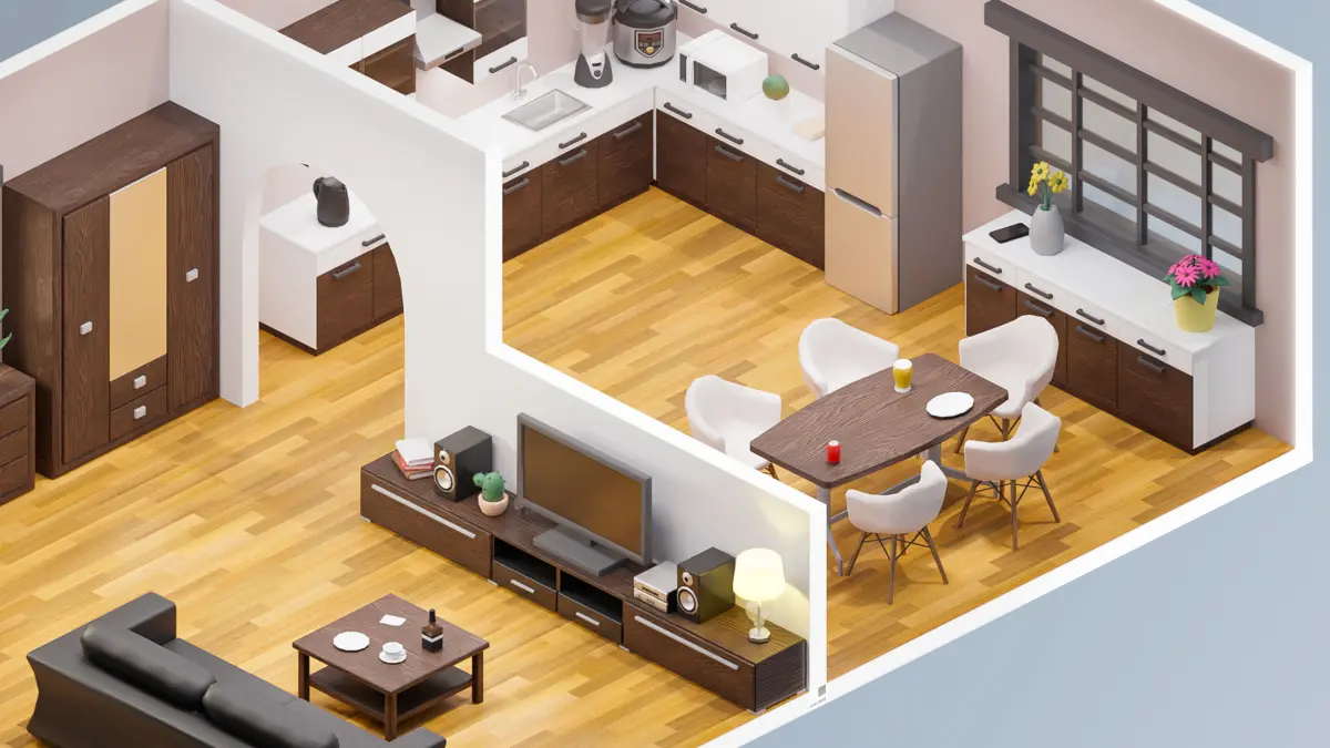 Walls, stairs, fences, sofa, chairs, bathroom assets, kitchen assets, bed, closet, clothing, table, door, props, flooring, flowers, lamp, window, pictures, etc.;
