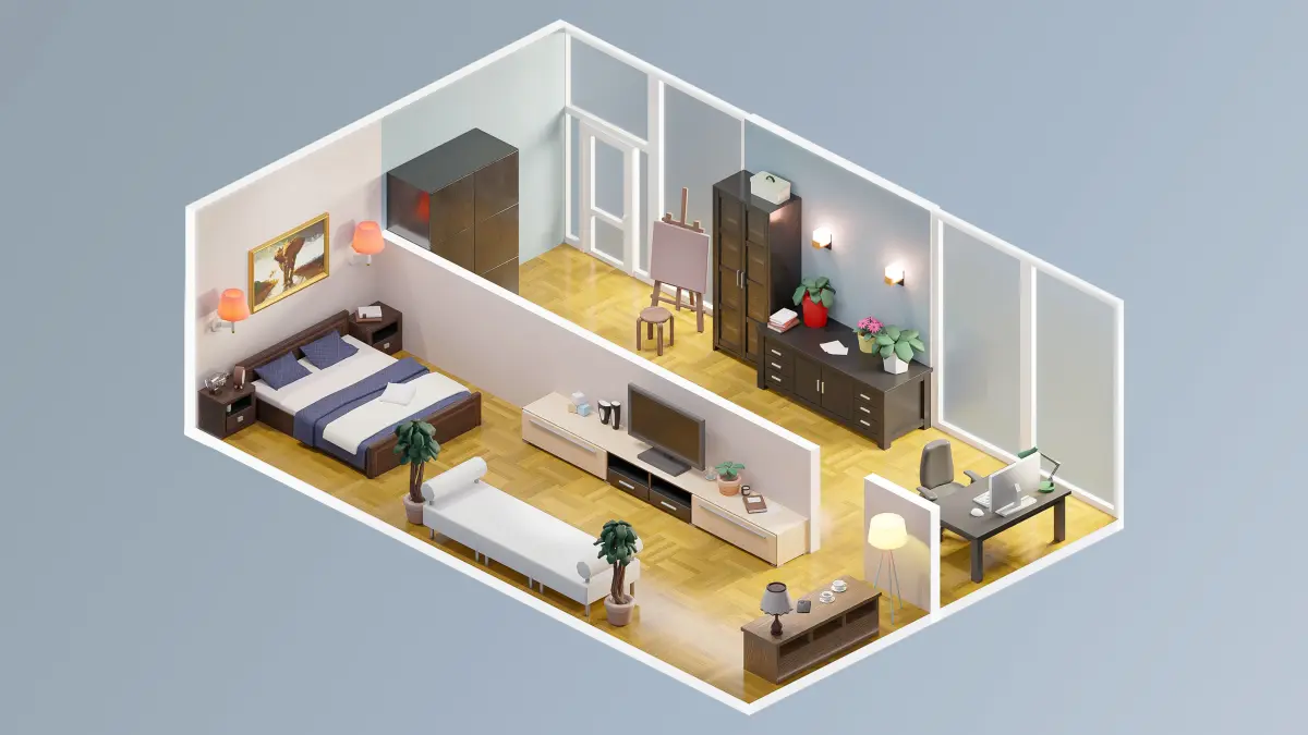 Walls, stairs, fences, sofa, chairs, bathroom assets, kitchen assets, bed, closet, clothing, table, door, props, flooring, flowers, lamp, window, pictures, etc.;