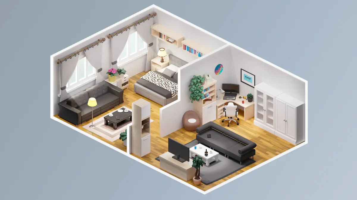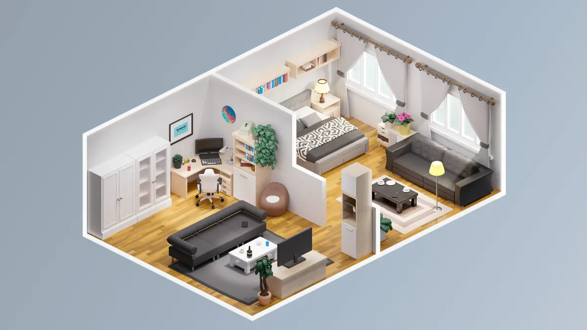Walls, stairs, fences, sofa, chairs, bathroom assets, kitchen assets, bed, closet, clothing, table, door, props, flooring, flowers, lamp, window, pictures, etc.;