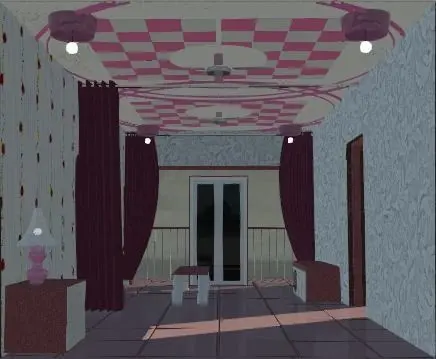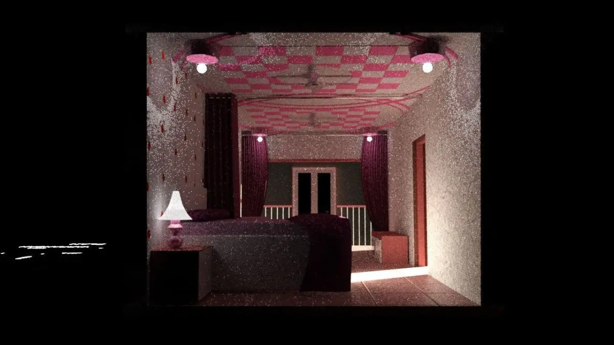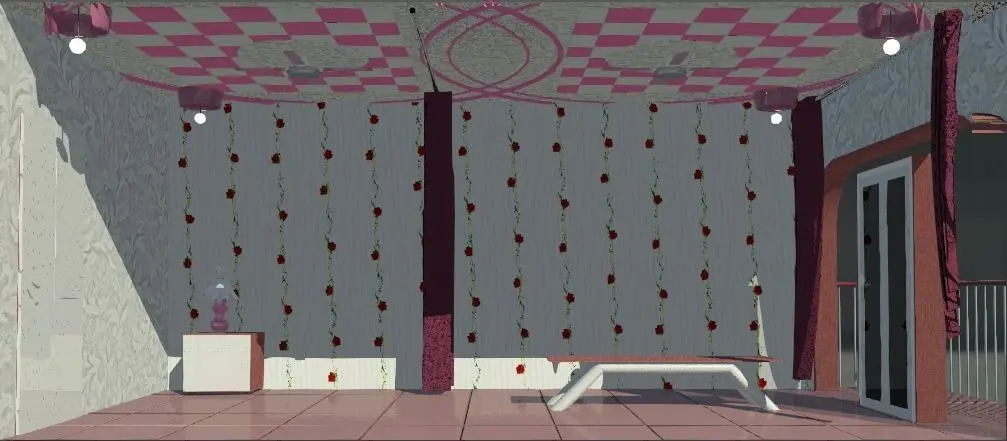 Space Planing of a single room consisting of queen size bed+wardrobe+bed Lamp+drawer+ceeling lamp+ fan+curtains+wallpaper+entertainment center+table+sofa Set and a front full size glass window