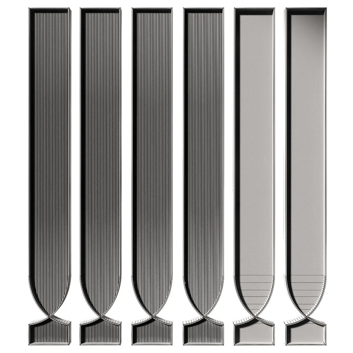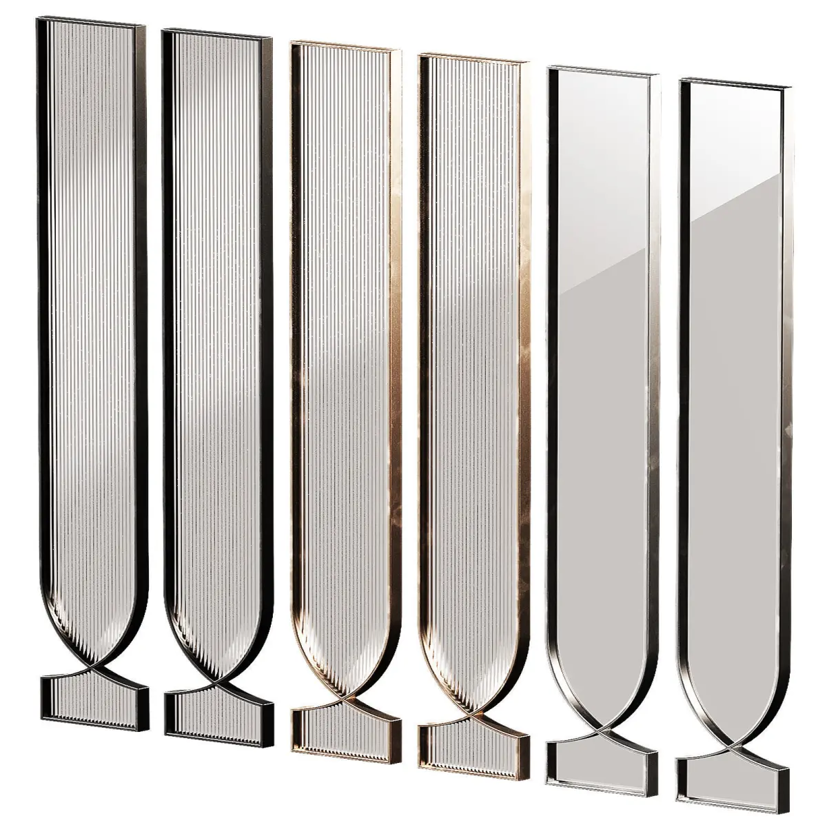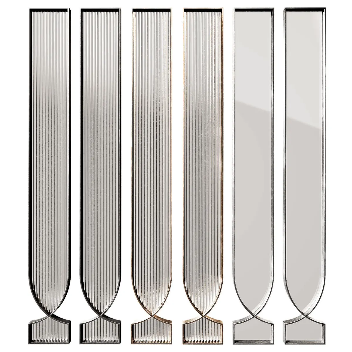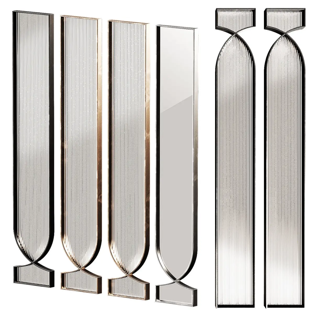 The 3D model contains designer interior metal partitions. 3 metal material options - black, bronze, silver. 2 glass options - corrugated ribbed glass and smooth tinted glass. Decorative room space divider. High partition. Arched semicircular shape.Can be used as a screen, partition, panel, fence.
