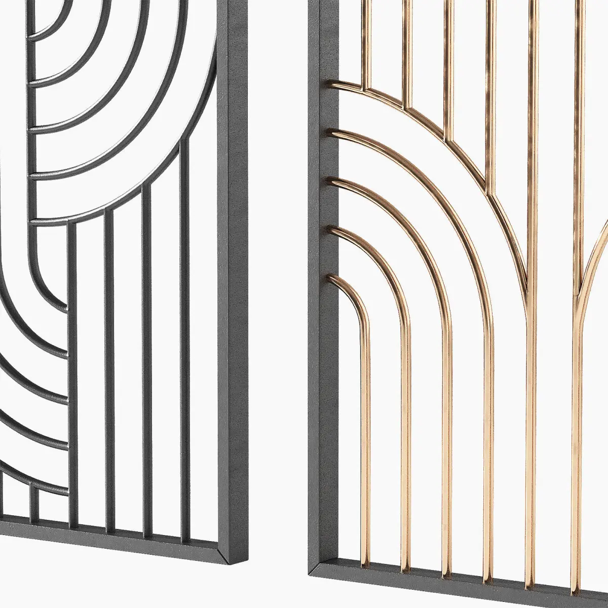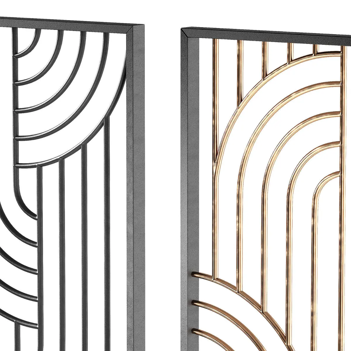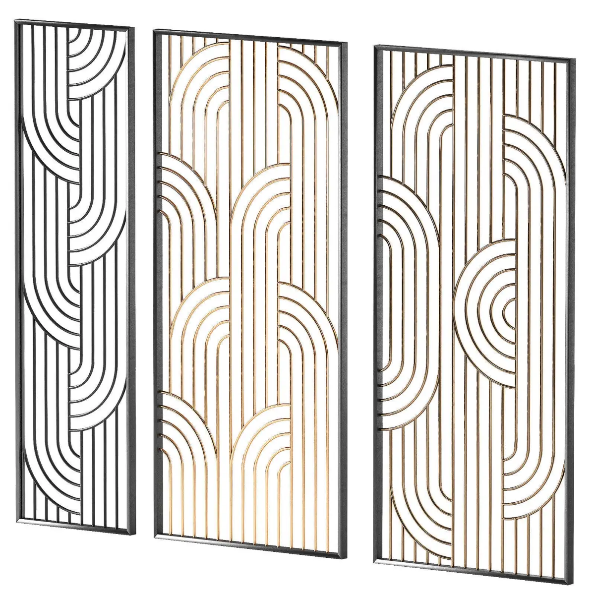The 3D model contains designer interior metal partitions.3 screen design options.3 material options - black, gold, bronze metal.Only procedural materials were used.Semicircular shape with smooth curves. Decorative room space divider.Can be used as a screen, partition, panel, door leaf, fence, decorative arched pattern, metal forging.