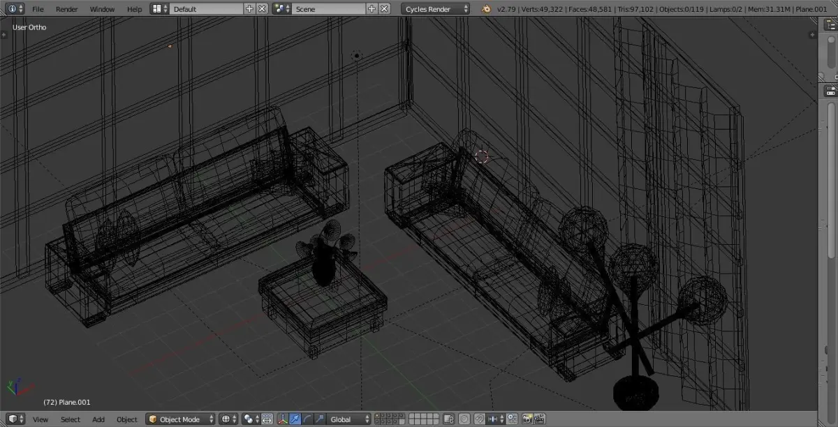 This model contains high quality realistic room with shining tiles, sofa sets , lighting stand and flower pot.