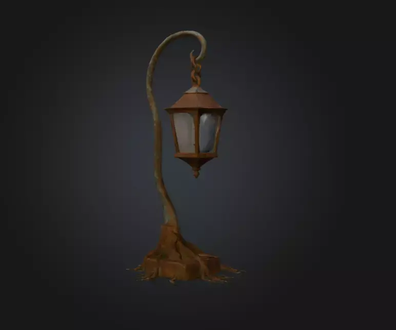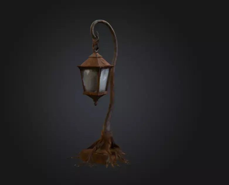 The weathered metal frame of the lantern exhibits realistic oxidation, patina, and rust, contrasting beautifully with the earthy tones and organic flow of the roots. The glass panels diffuse light softly, creating an ethereal glow perfect for fantasy worlds, dark forests, or magical village environments. Each curve and texture detail has been carefully sculpted and PBR-textured to achieve a balance between realism and fantasy aesthetics.