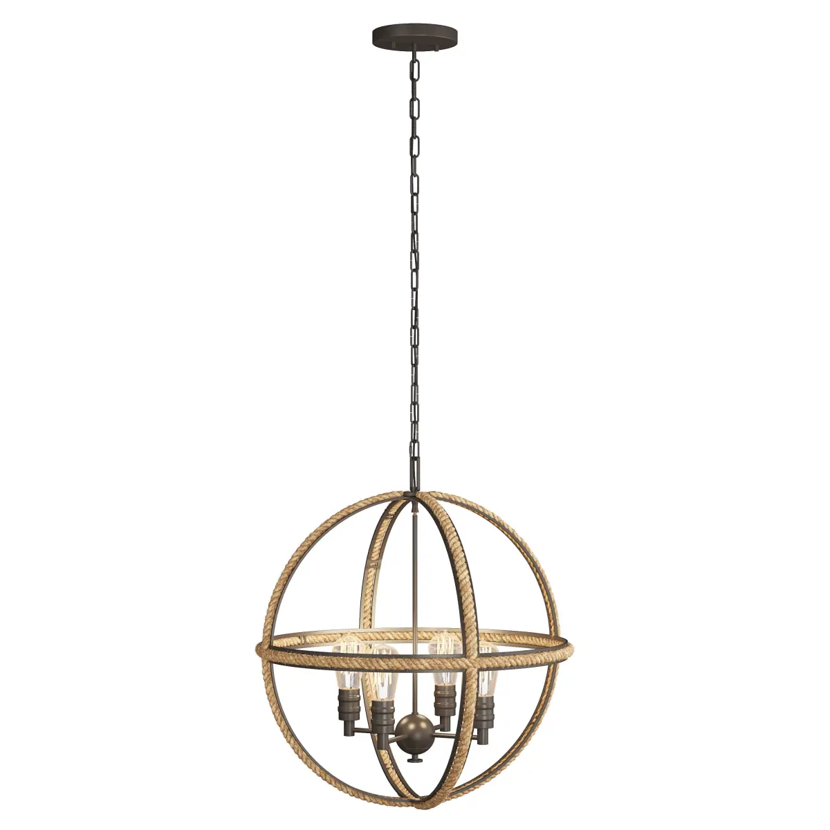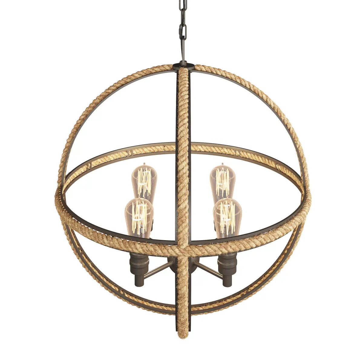 This attractive rustic chandelier features three intertwined rings laced in natural rope surrounding an over-scaled Bronze cluster for an industrial inspired coastal feel!