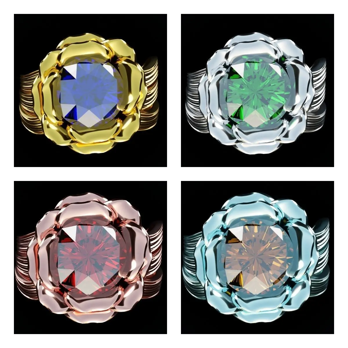 I am glad to present you a high-polygonal set of 3D models of rings in the form of a lily flower, there are four of them: gold with sapphre, silver with emerald, rose gold with ruby, and platinum with citrine. The set itself is well suited for your projects, animation, advertising, videos and so on.