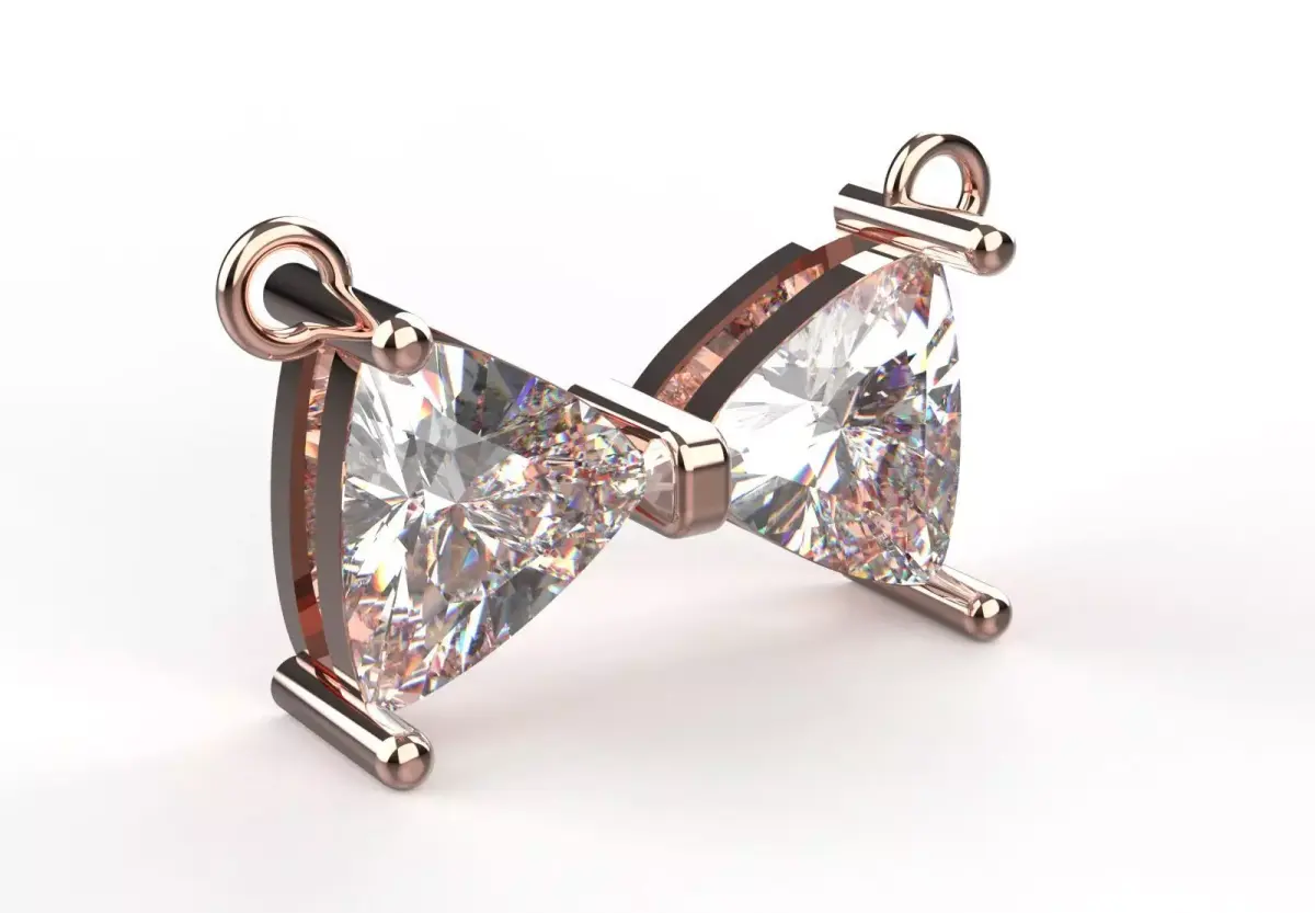 Technically, this pendant is carefully crafted from rose gold, whose warm and unique color creates a beautiful contrast with the sparkle of the diamonds. The main part of this pendant consists of two large diamonds with a Trillion cut. This triangular cut, due to its many facets, reflects light beautifully and has a wonderful shine. The two diamonds are connected by a small gold ring, creating a symmetrical and attractive shape. Two rings are placed on top of each diamond to connect to the chain.