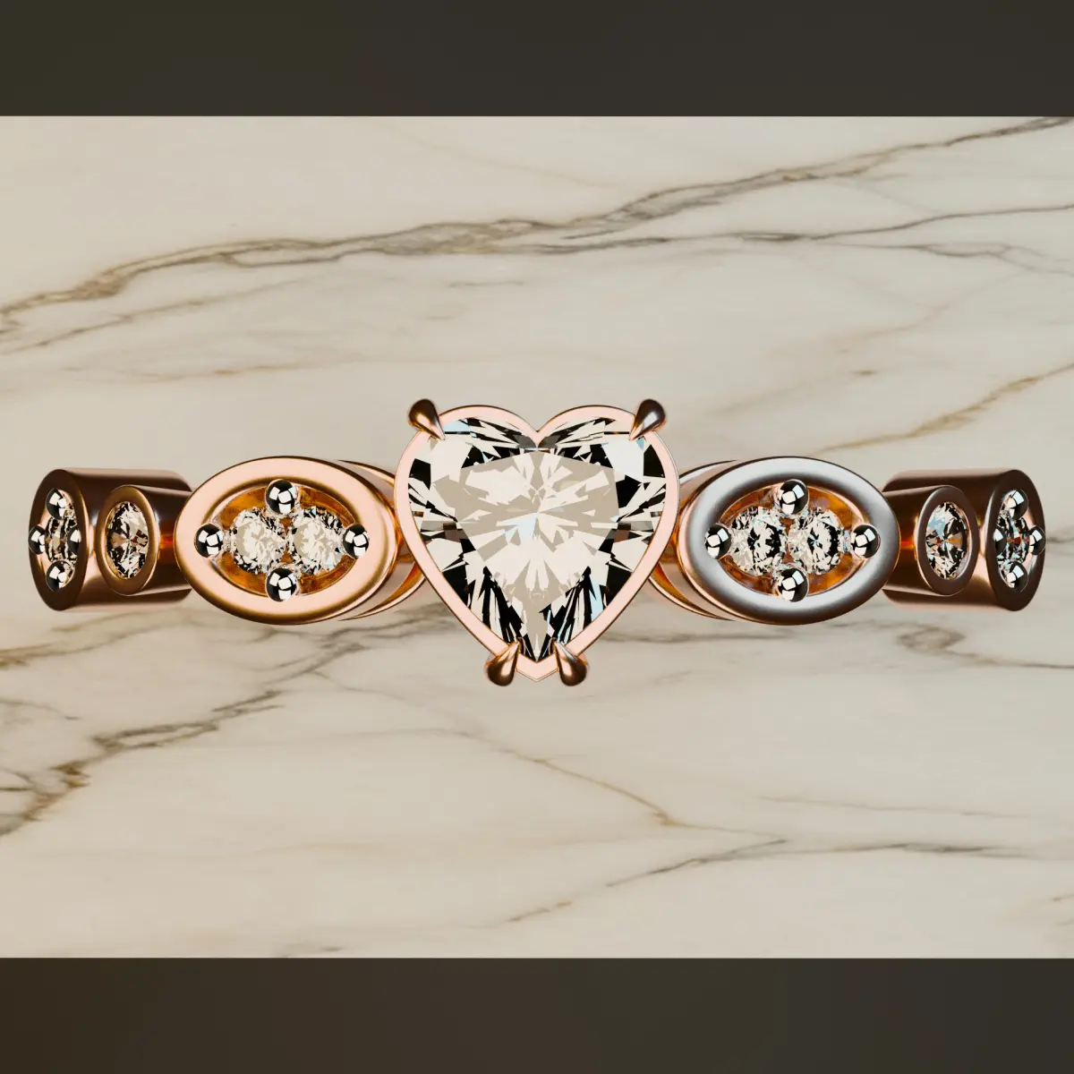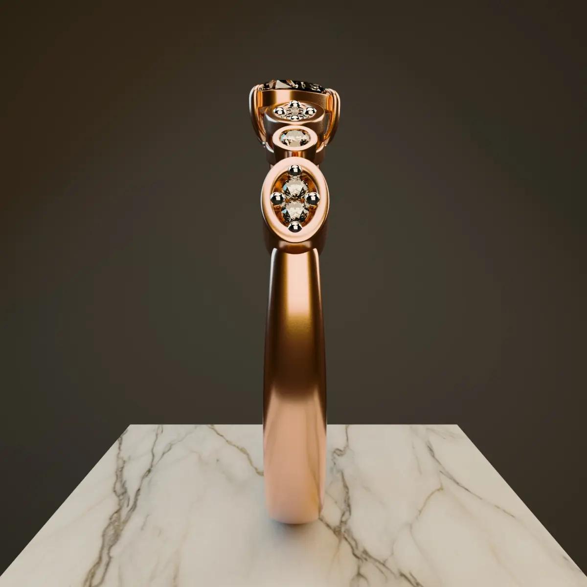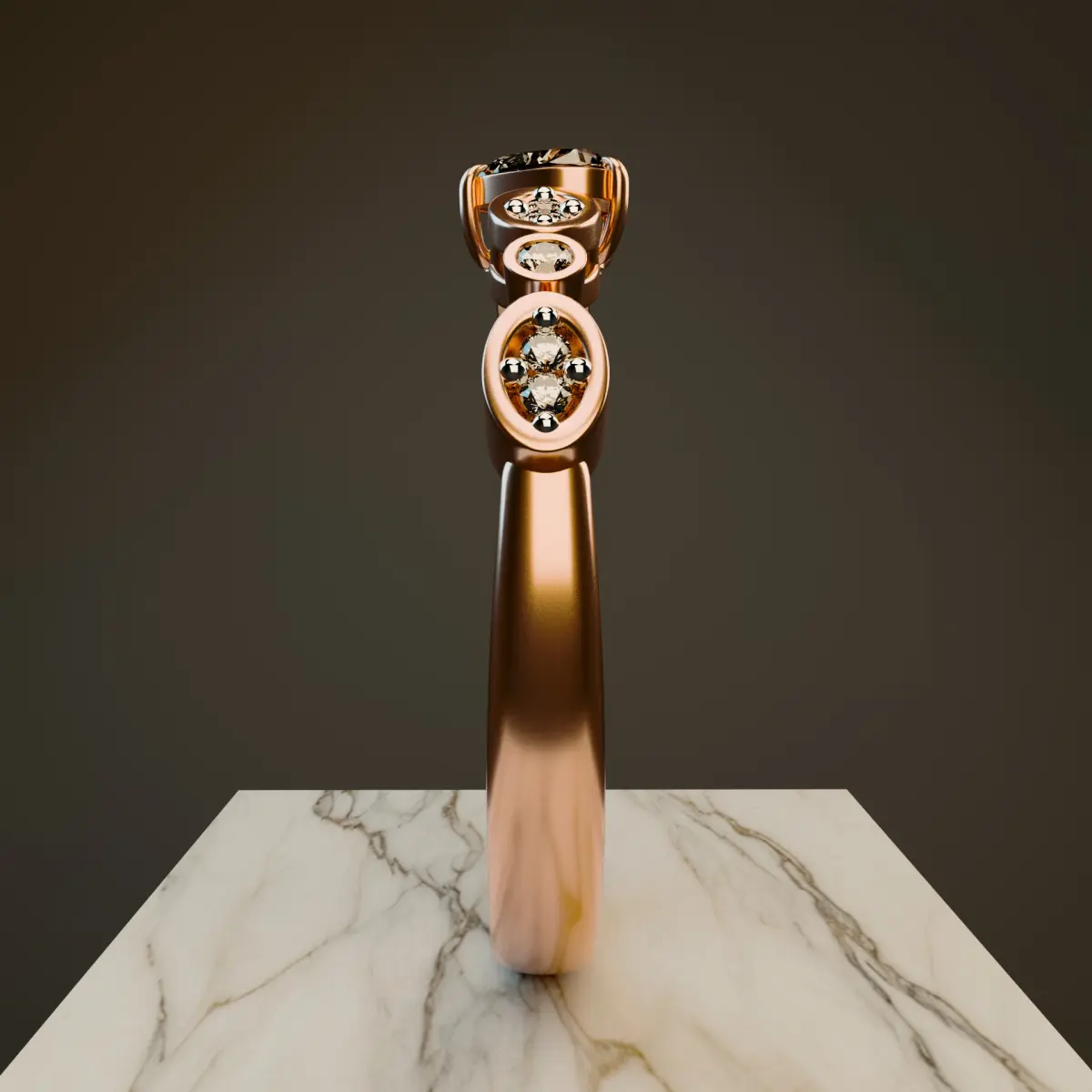 The ring features a polished rose gold band adorned with a symmetrical arrangement of oval and round gemstones, accurately placed in realistic prong and bezel settings. Crafted to mimic high-end fine jewelry, this model is optimized for close-up renders and supports both real-time and offline rendering pipelines.