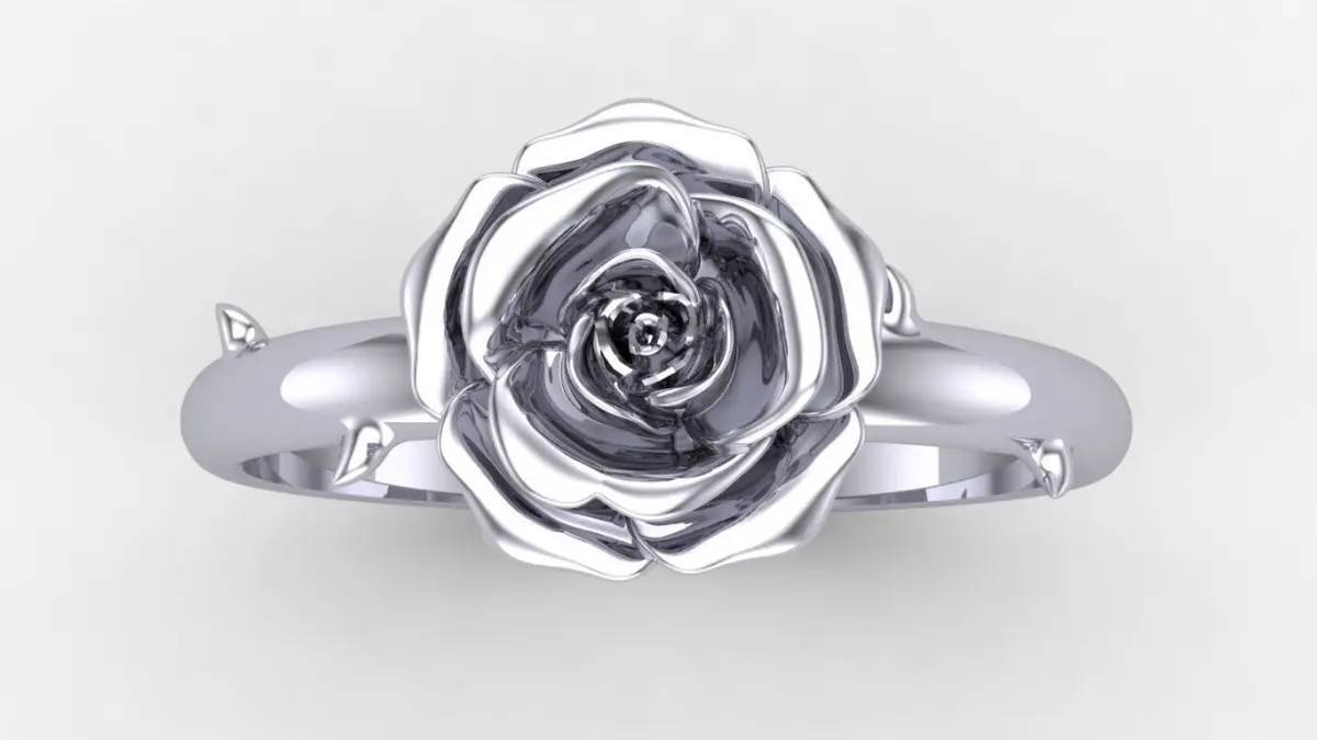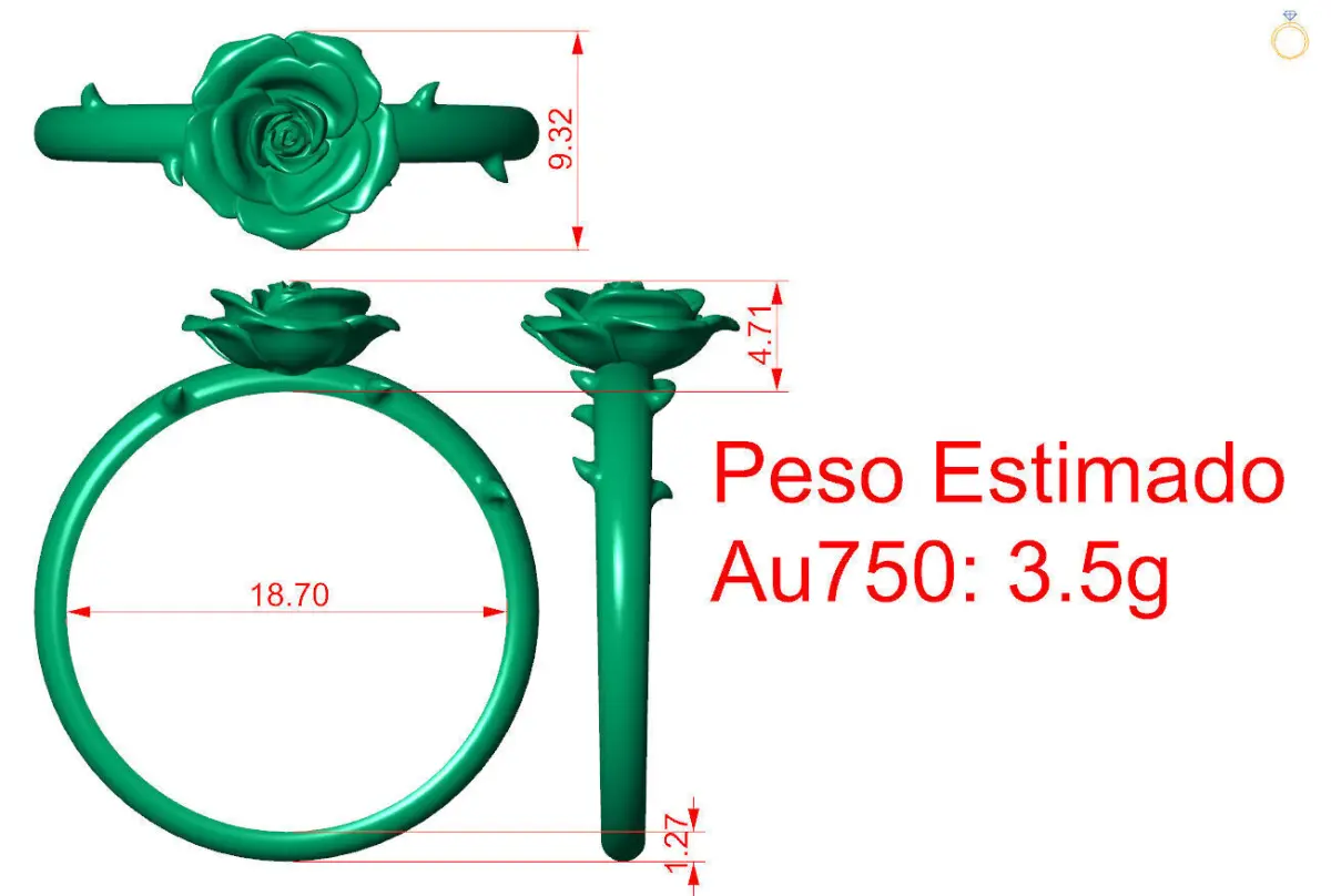 Rose Ring.3D design of a ring with an estimated weight of approximately 3.5g in 18K gold (750). The piece features a high-relief rose sculpture on the top and a thin shank with details resembling a stem. The dimensions of the piece are shown in the image in millimeters.The file is provided in STL format.The model is watertight (manifold), suitable for 3D printing, including wax printing for jewelry casting.