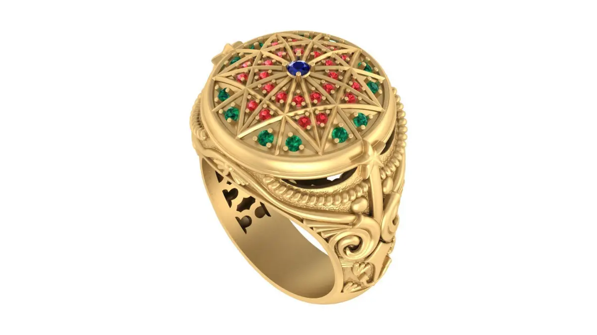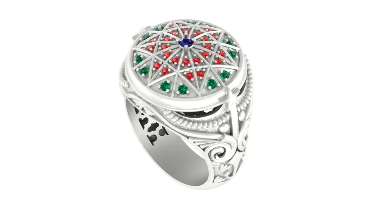 This is a Rosetas Ring design, crafted in CAD software, featuring intricate details and vibrant gemstone arrangements. The ring is a statement piece that combines elegance and tradition with a modern touch.