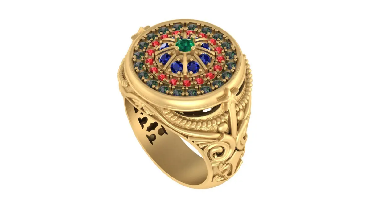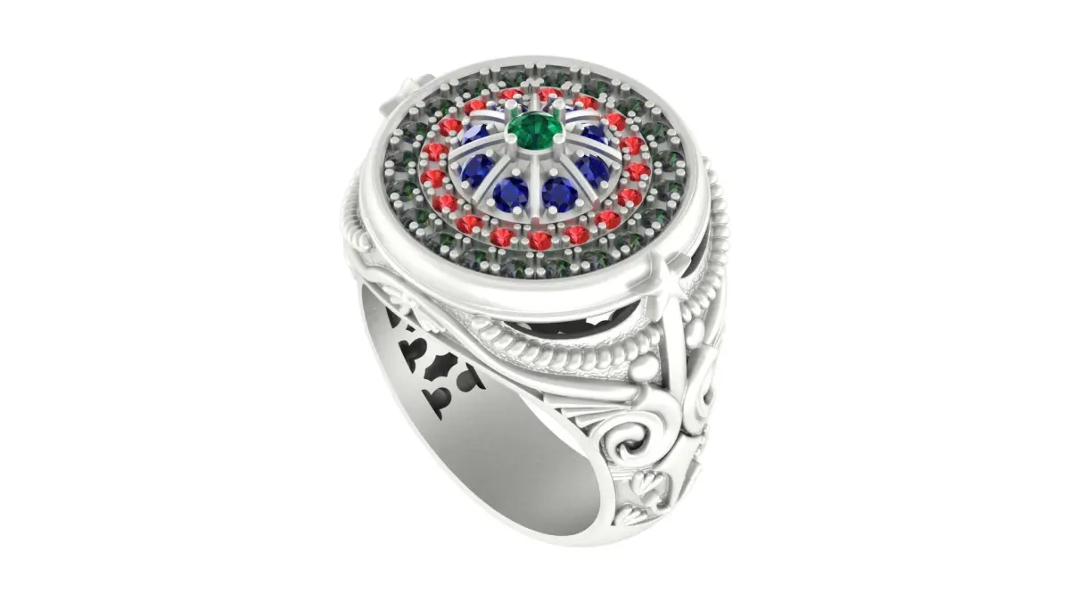 This image showcases a 3D-rendered design of a luxurious ring that blends detailed craftsmanship with colorful gemstone embellishments. Designed for elegance and versatility, it is ideal for special occasions or as a collector's item. Below are the full details: