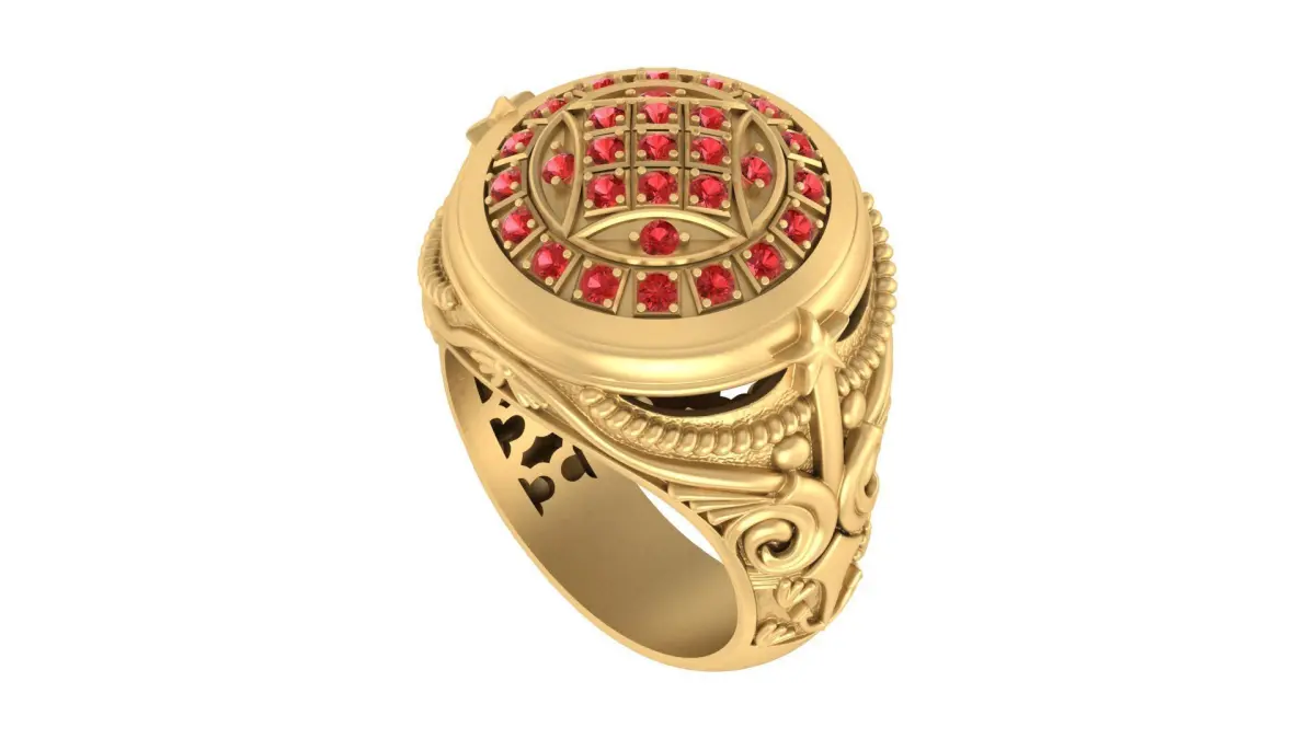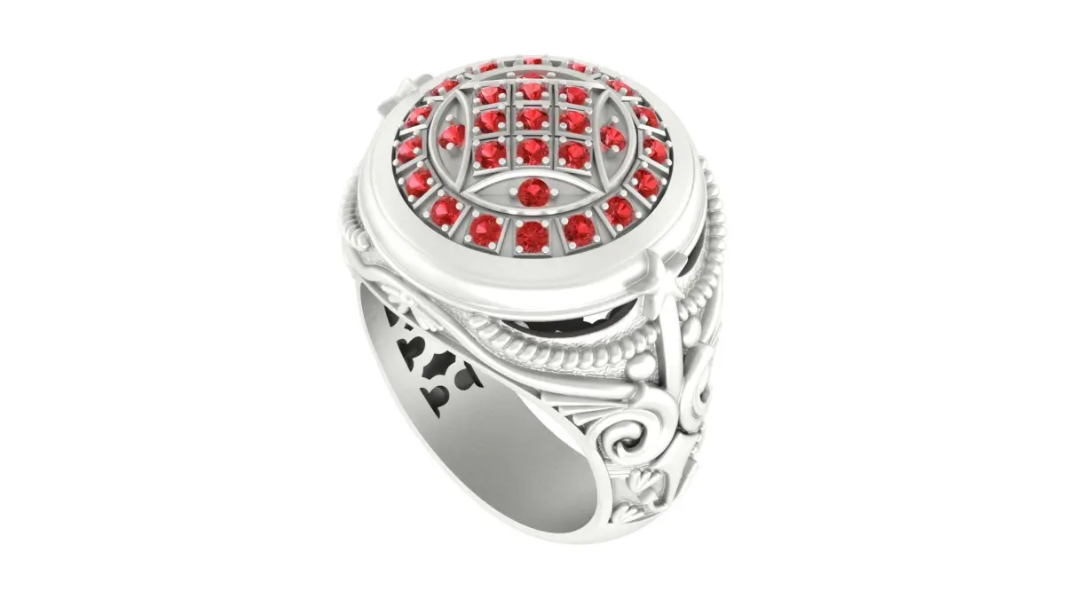 A 3D perspective of the ring reveals the placement of the gemstones and decorative elements around the design.The domed design and gemstone arrangement are clearly visible.Side Views: