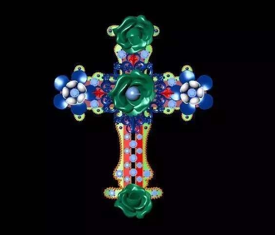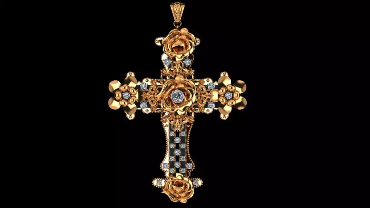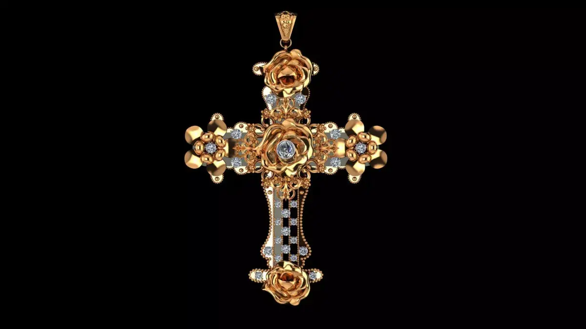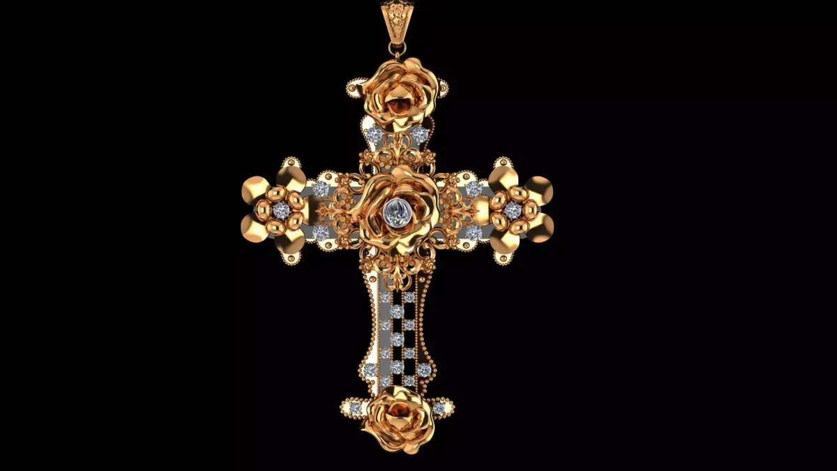 This pendant features a cross-shaped framework crafted in high-karat gold, integrating floral and gemstone detailing with symmetrical precision. The vertical shaft incorporates a checkered inlay of alternating black and silver segments, bordered by micro-set diamonds for enhanced brilliance. Three prominent rose-shaped gold elements are positioned at the top, center, and bottom, each housing a faceted gemstone in bezel or prong setting.