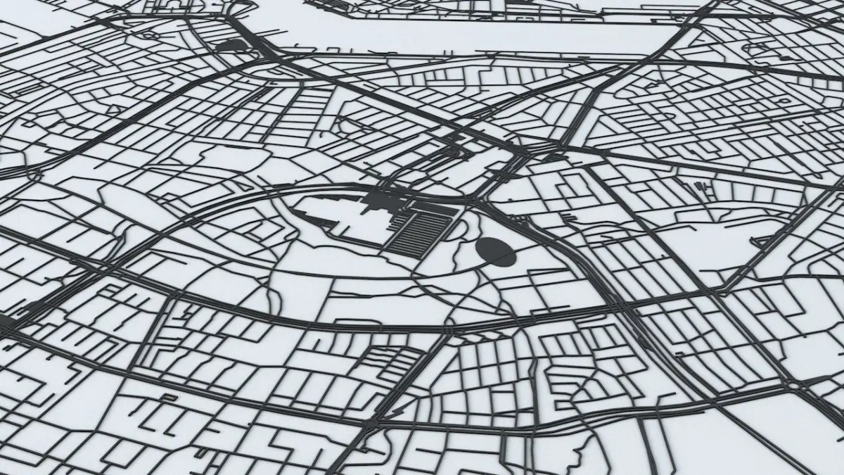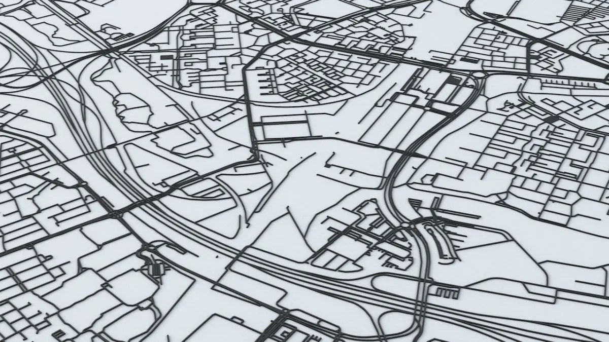 - the model is positioned on a flat surface (road network is on the “floor” - no elevation data included)