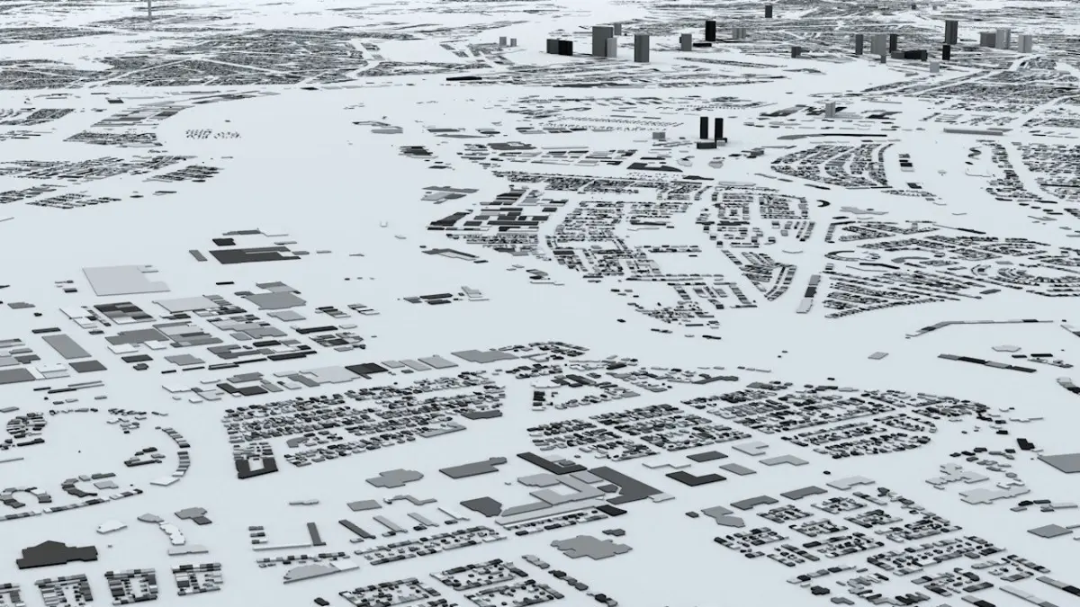 - the model is positioned on a flat surface (all buildings are on the “floor” - no elevation data included)