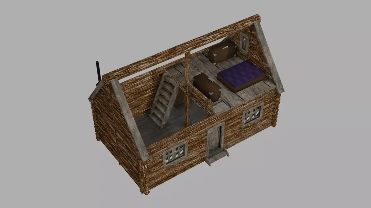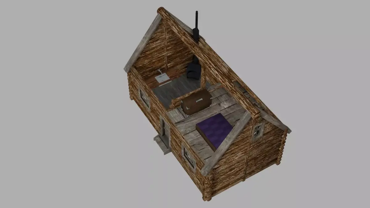 Includes bed, wood-burning stove/fireplace with chimney, cabinets, sink, chest, and table with chairs.