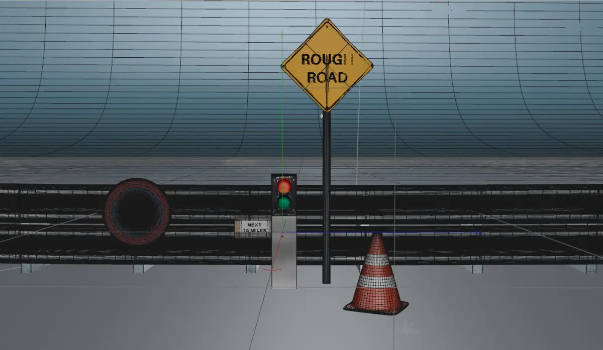 RoughRoad Shield, Crash Barrier, Traffic Light, Stop Sign and Pylone.Modeled in cinema 4d with included textures, materials, lights, stage and advanced render settings.