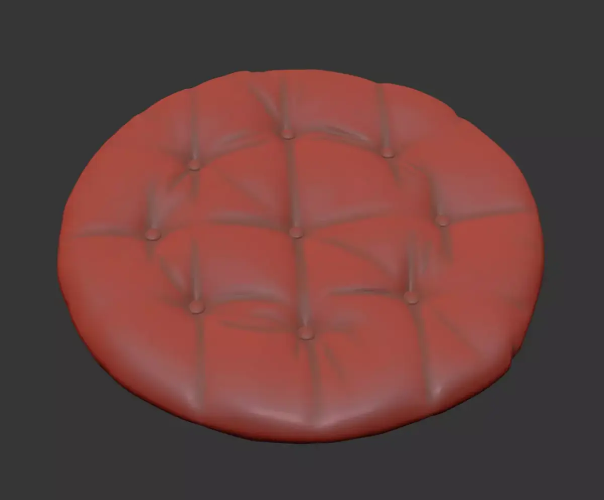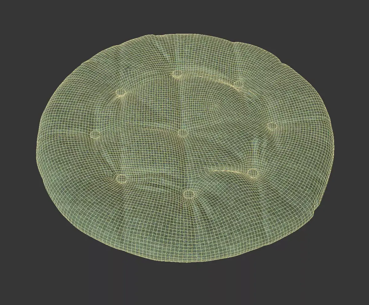 This is a 3D model of a tufted round cushion, featuring classic button tufting and a detailed woven fabric texture. The model has quad topology, is fully UVW mapped, and includes 8K texture maps. It is suitable for interior visualization and furniture decoration. Multiple file formats are provided: .max, .obj, .fbx, .abc, and more.