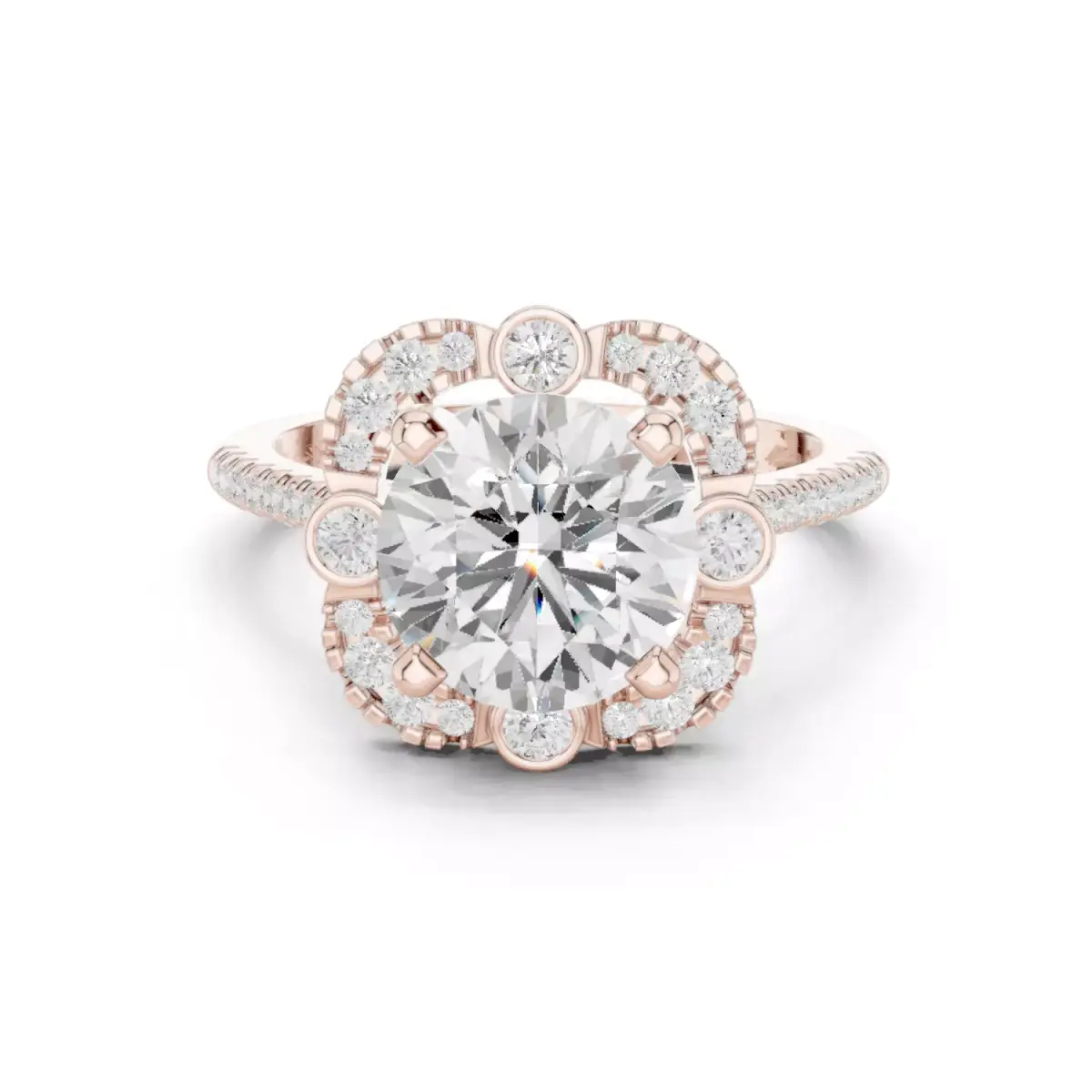 This sophisticated round halo engagement ring 3D model showcases a brilliant round center stone enhanced by a floral-inspired halo arrangement with evenly spaced accent stones, creating a distinctive luxury appearance. The elegant halo structure adds depth, sparkle, and visual presence while maintaining a refined and timeless character suitable for premium bridal collections.