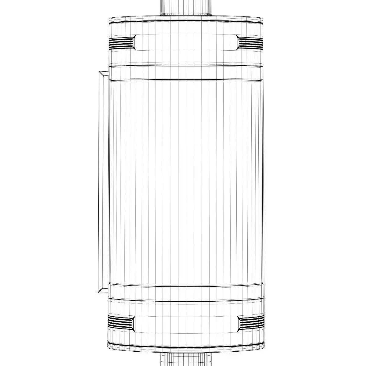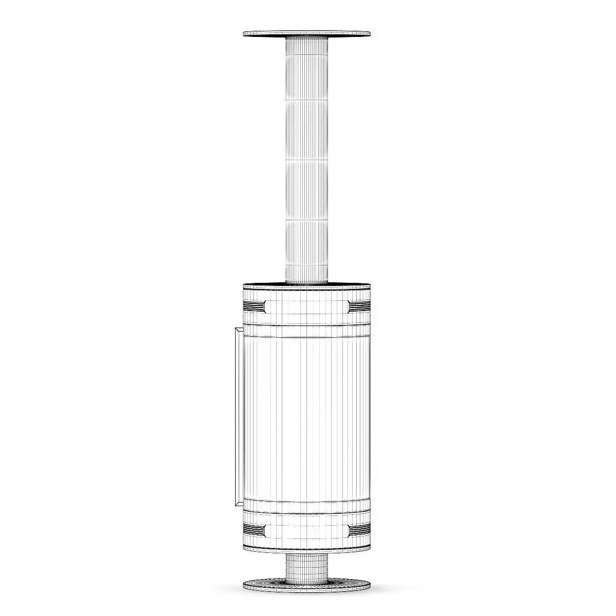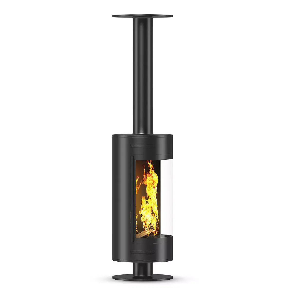Round black metal fireplace with glass door reaching from floor to the ceiling. This 3D model contains illuminative fire material.