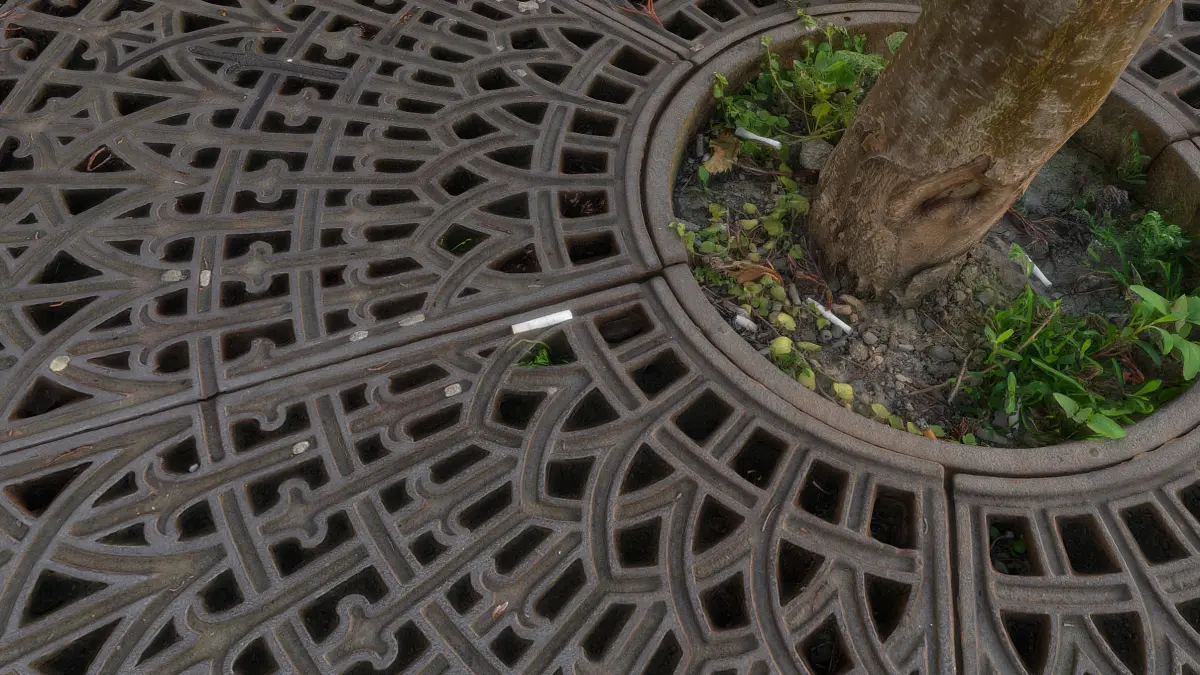 Rounded metal tree grille grate, cast iron tree guard bed tree protection with some urban dirt and rubbish