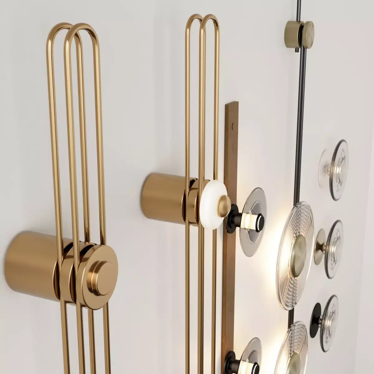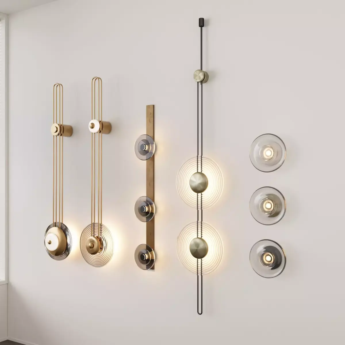 This wall light collection features elegant linear forms combined with circular glass and metal elements, suitable for residential, hospitality, and high-end commercial projects.