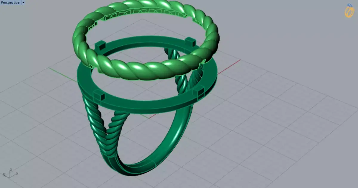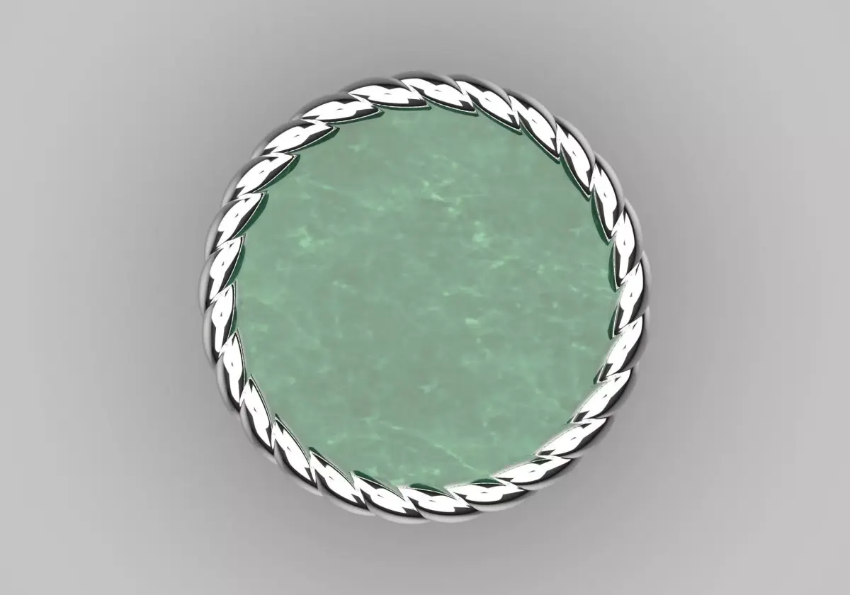 Surrounding the jade is a striking twisted rope frame made of the same shiny white gold. This detail adds an element of texture and complexity, enhancing the overall aesthetic of the piece. The rope pattern creates a sense of movement and gives the ring a dynamic quality.