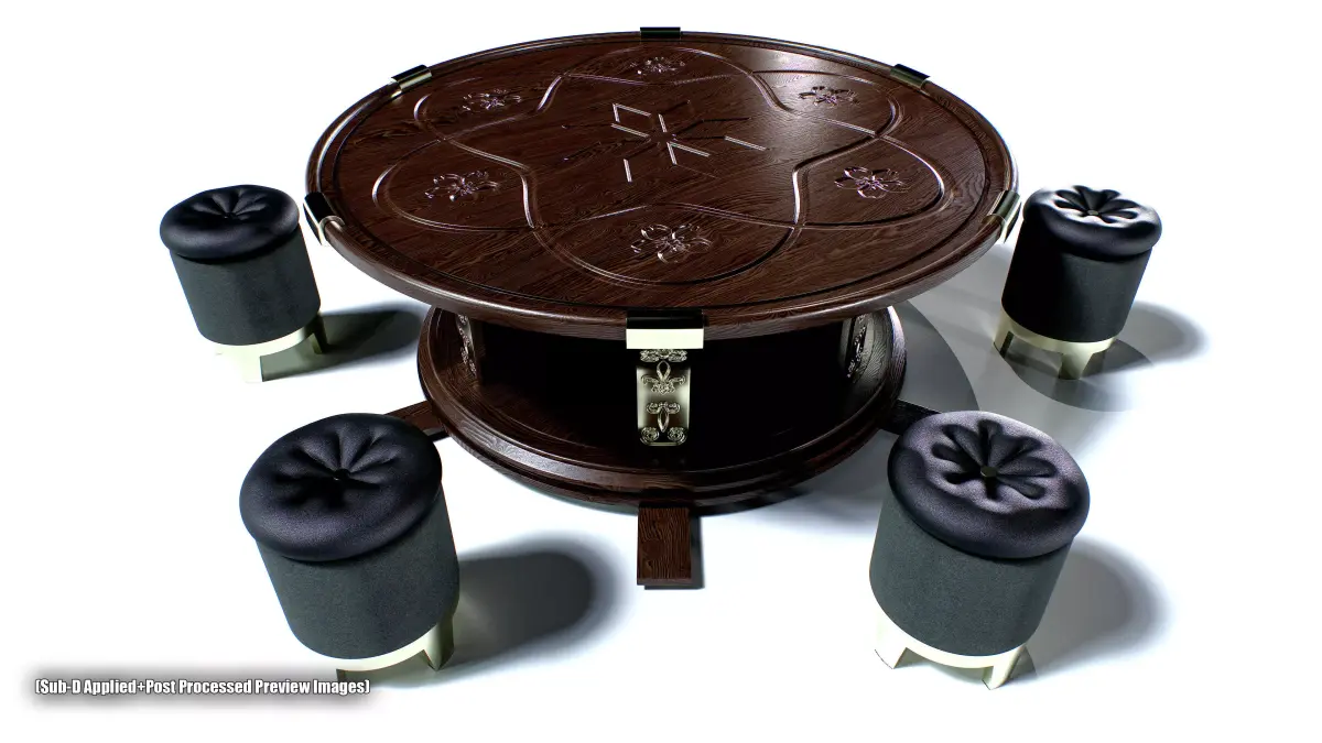 A Mid-Poly Model of a Round Table with 6 Cushioned Stool Chairs.