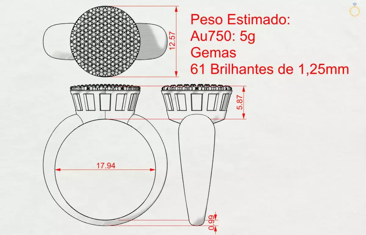 Round-top cluster ring featuring 61 brilliant-cut stones of 1.25mm, with an estimated weight of 5g when crafted in 18K gold (Au750).The elevated circular design with micro-prong setting ensures consistent brilliance and a refined finish.All measurements of the piece are shown in the image in millimeters.
