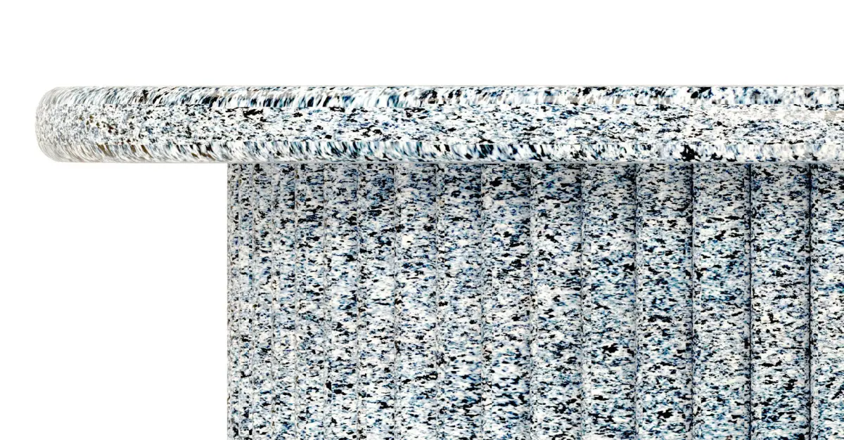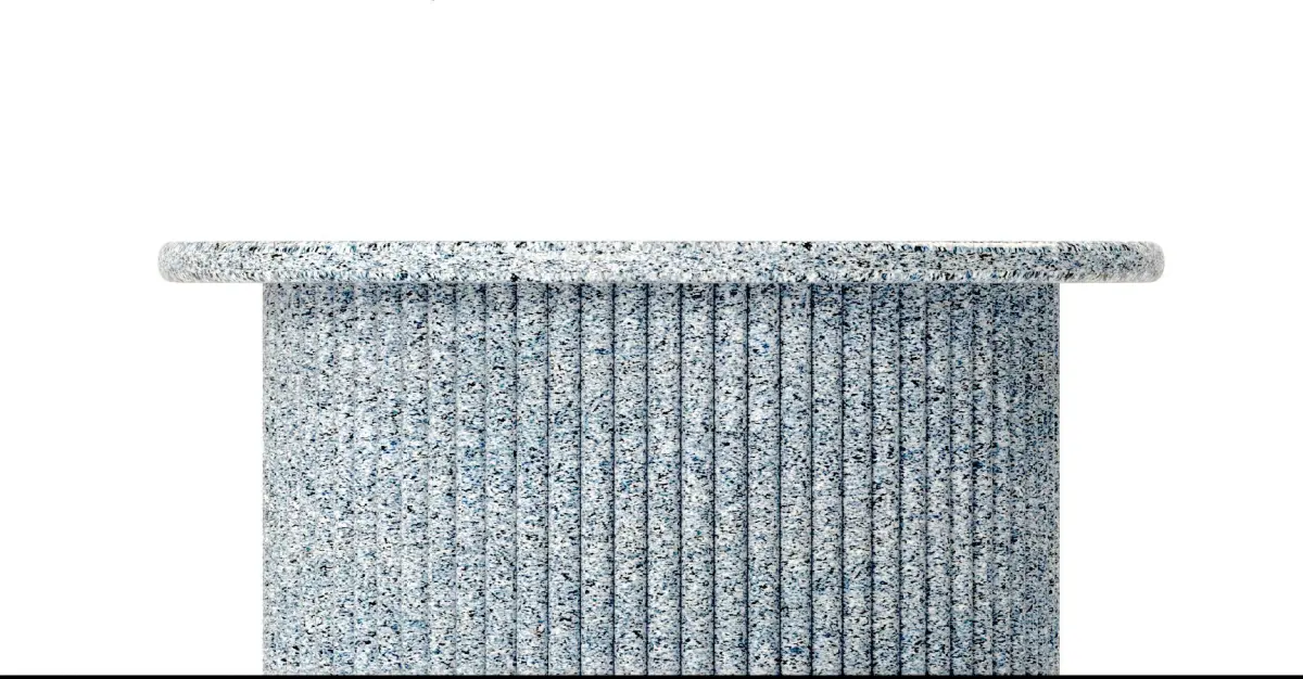 This table is very modern and is great for outdoors and indoors, and it compatiable with many interior styles. The top consist of a round, chamfered slab of thick marble, which is resting on cylindrical block of the same type of marble, arranged in a radial pattern. The colors are white, black, and blue.