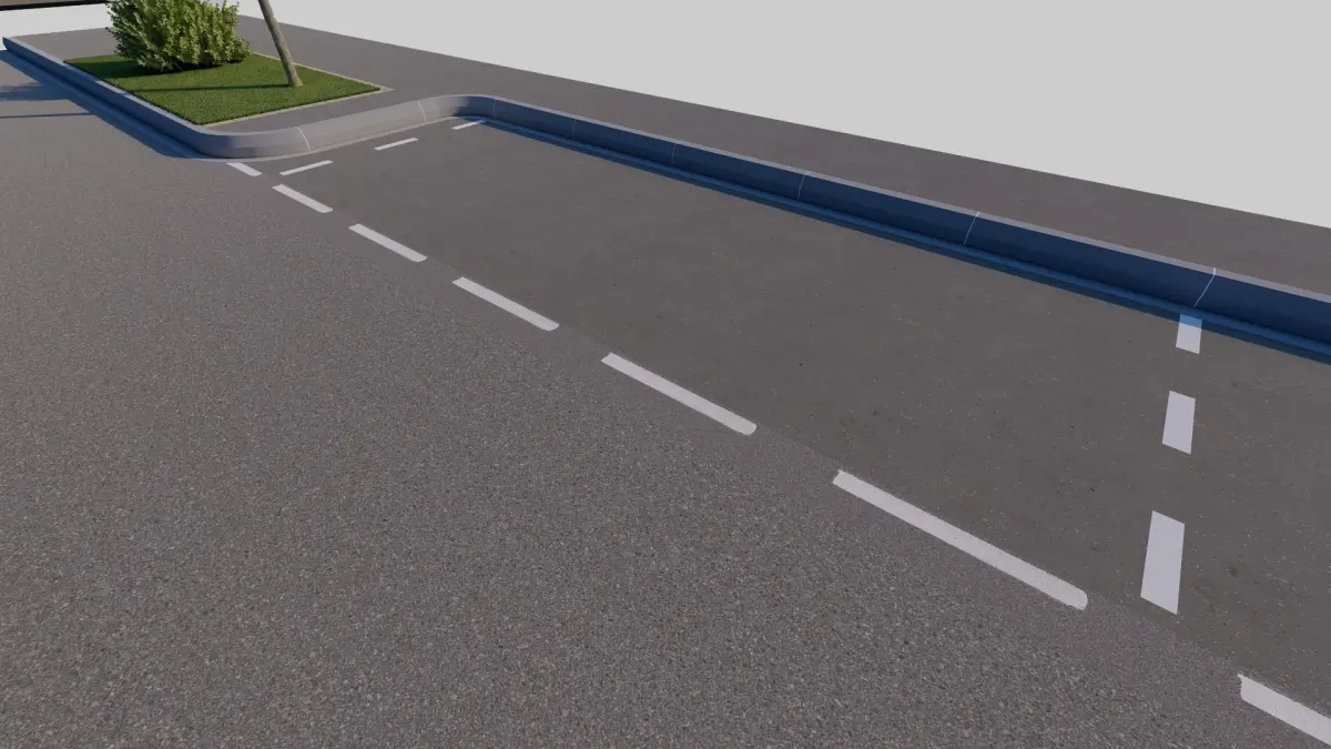 Deux morceaux de routes : une route et un trottoire avec une partie herbe + une route et un trottoire avec une partie herbe et place de stationnementt. les morceaux sont compatible afin de créer une route continu. Dimensions : -Route = 6,00m -Trottoir = 2,90m