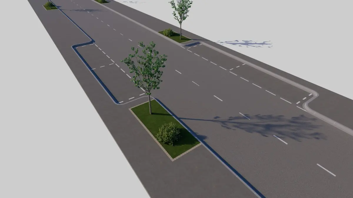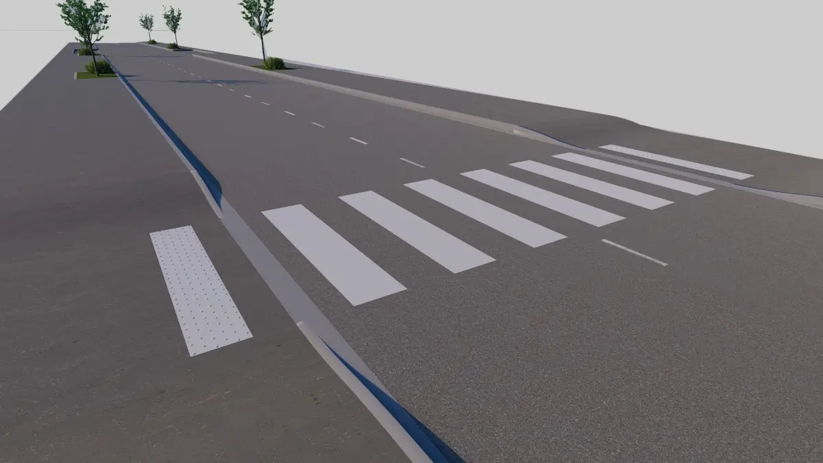 Routes 100m avec passage pieton et zone d'herbe + place de stationnement : -Route = 6,00m -Trottoir = 2,90m