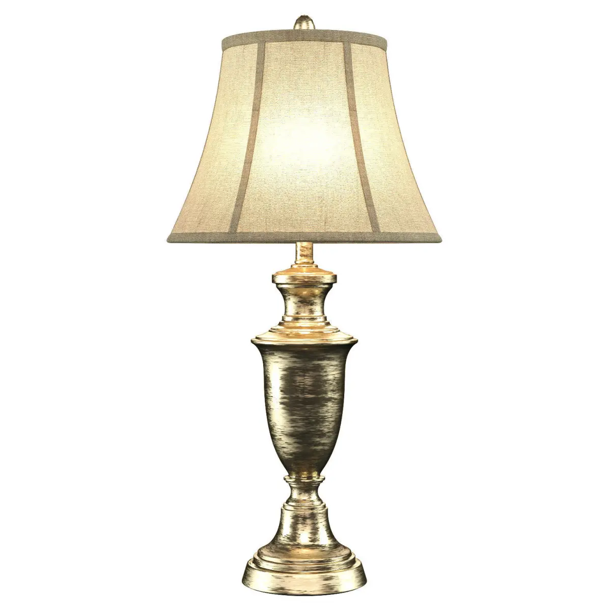 This beautiful 30.5” table lamp brings elevation and gilded style to any space in your house. The base, which is crafted from metal and steel, gracefully curves and forms an urn-inspired shape for dimension and traditional appeal. The antique brass finish brings shimmer and a hint of glamorous appeal and the crisp bell shade that brings a classic touch fit for any elegant atmosphere. Top it on a wooden end table in the living room to add a glow to the seating ensemble. Or, place it on your foyer console table with a beautiful blooming vase for a welcoming vignette.Product Details