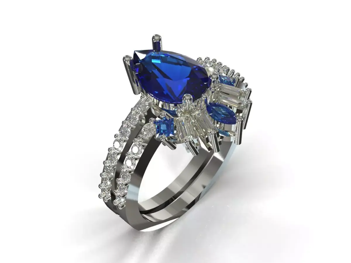 Model file wr0131 is one of the most special and detailed designs in our collection. This duo set, centered around a large teardrop gem and asymmetrical side stone arrangement, is designed for those looking for a piece of jewelry that goes beyond classic and repetitive models.