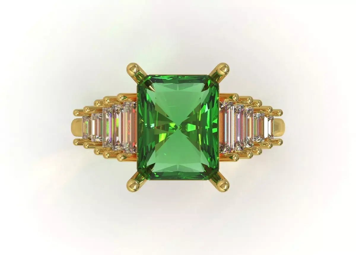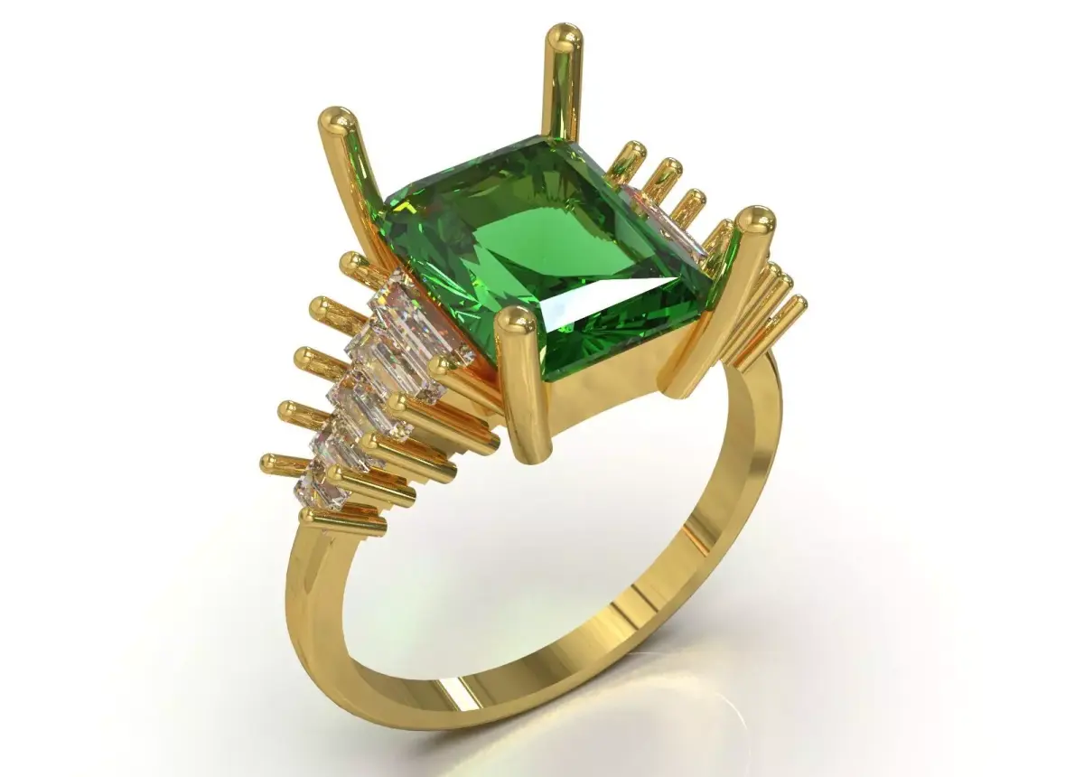 - Baguette Gems: On one side of the ring's shoulders, a row of narrow rectangular gems (baguette cut) is set diagonally in a stepped arrangement.