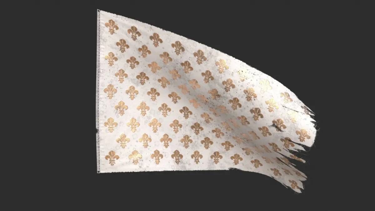 The 3D model of the Royal French Flag used by the French royal family (Bourbon)from 1365 until 1792. The model includes 3 materials for clean version, dirty version and bloody version. All colored parts are seamed and many details as folds and wrinkles around all seams to get the most realistic fabric effect.