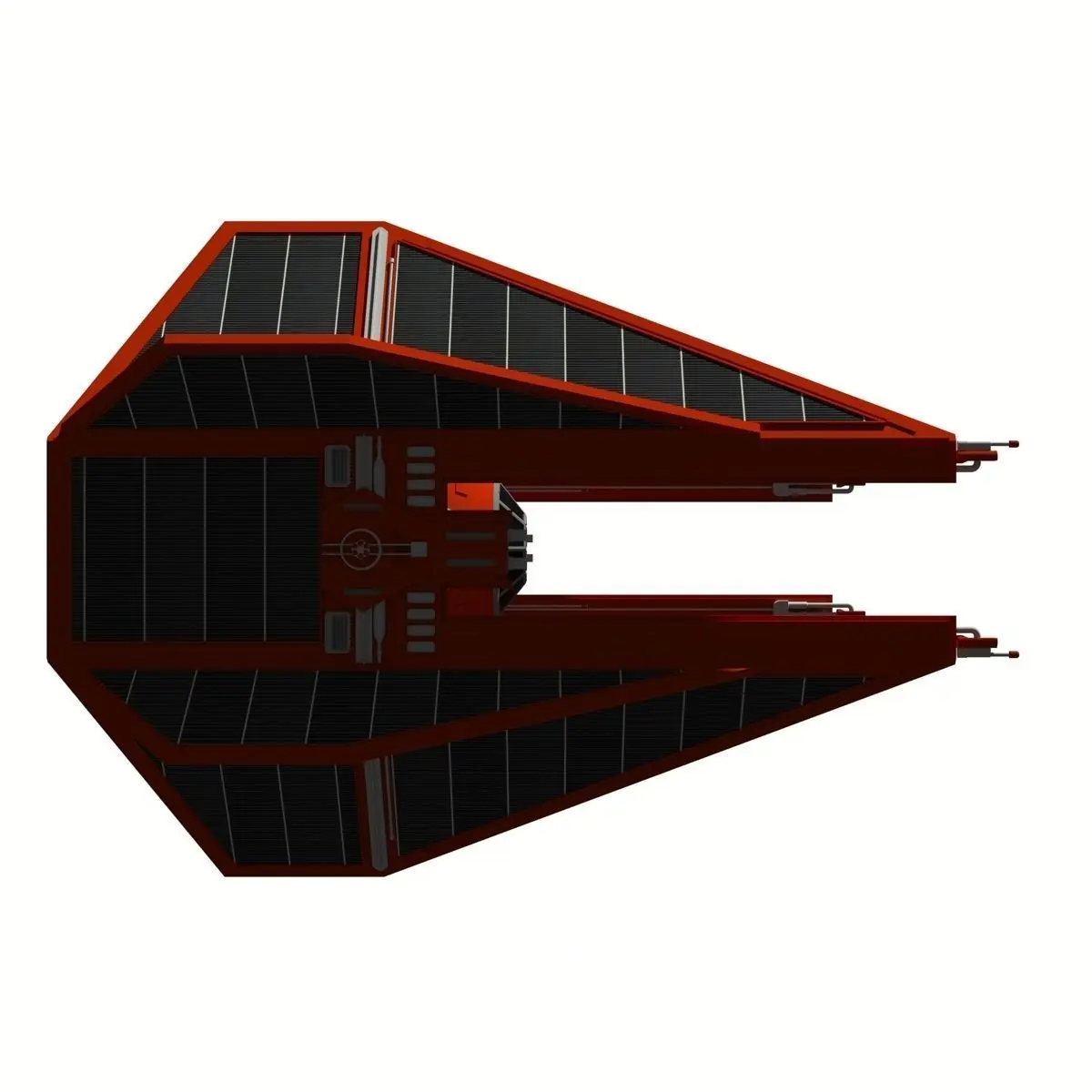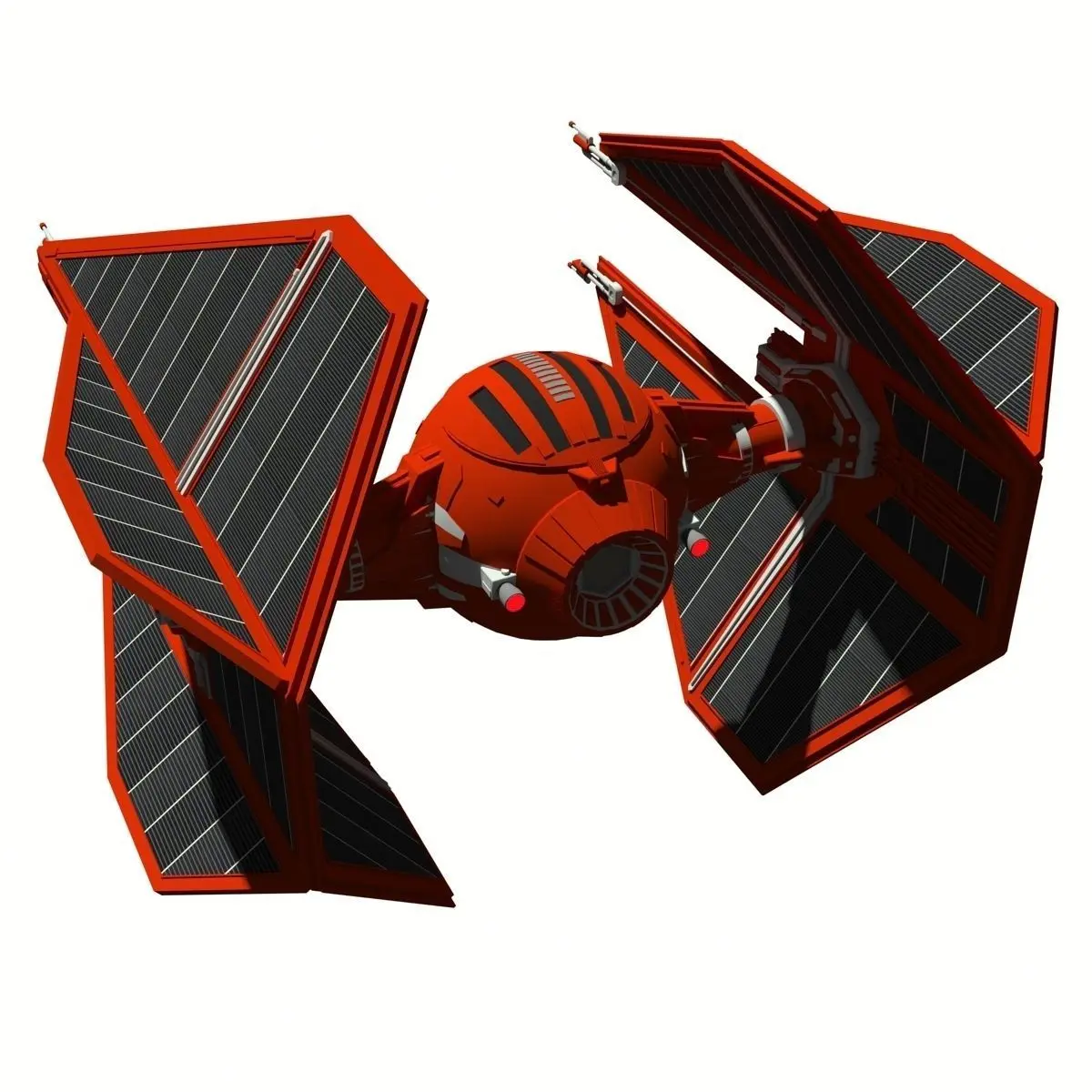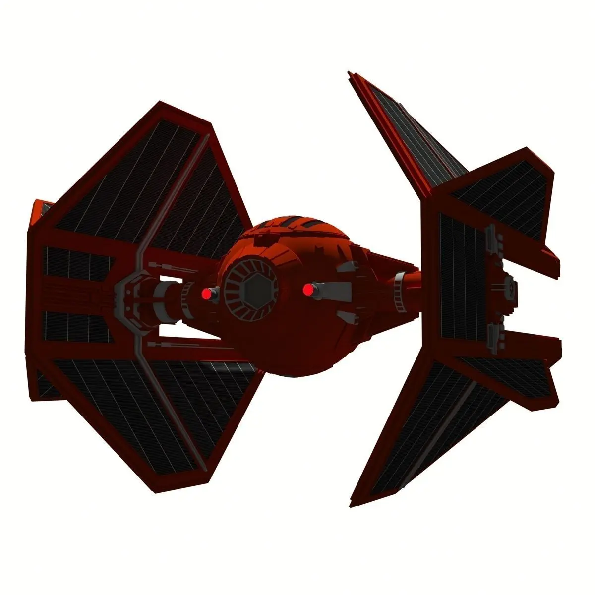 A model of the TIE (Twin Ion Engines) Interceptor of the Royal Guard of the Empror Palpatine from the Star Wars universe. This starfighter is an imperial ship used by the Imperial Galactic Navy.