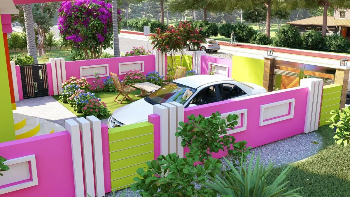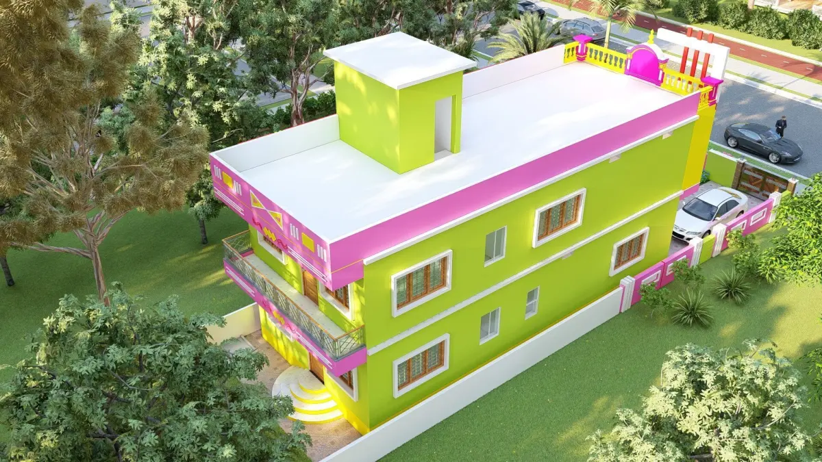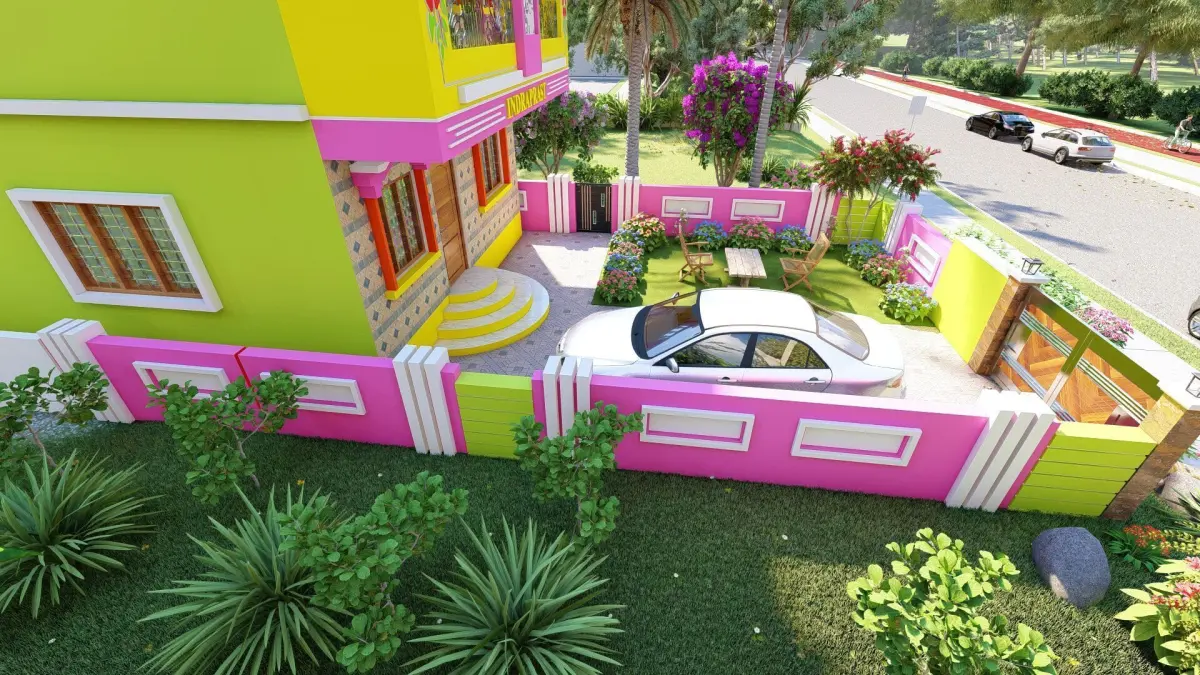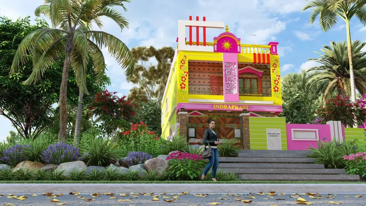 Front elevation detailingBalcony with traditional railingsCompound wall with gateArchitectural ornamentation (pillars, motifs, jaali)Separate floors (ground + first floor)Indian-style windows and doorsFully textured and render-ready