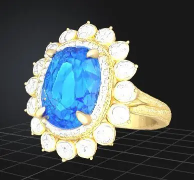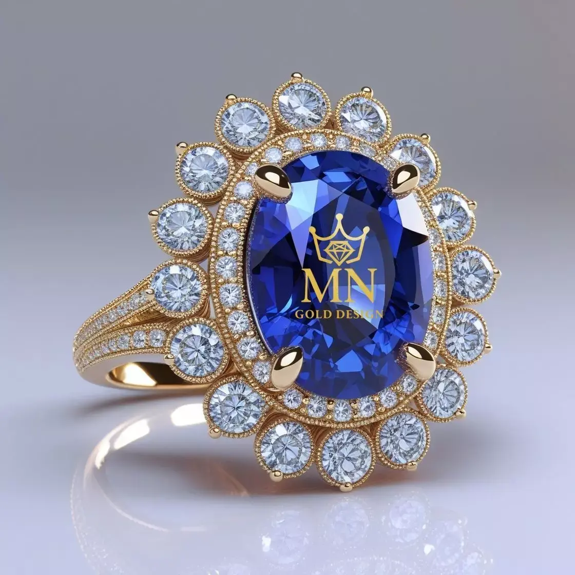 Step into timeless elegance with the Royal Midnight Sapphire Ring, a breathtaking 3D model of a high-end engagement ring. Designed to captivate, this piece features a majestic deep-blue oval sapphire as the centerpiece, surrounded by a radiant halo of brilliant-cut diamonds.The intricate band is encrusted with micro-pavé diamonds, set in warm, polished yellow gold